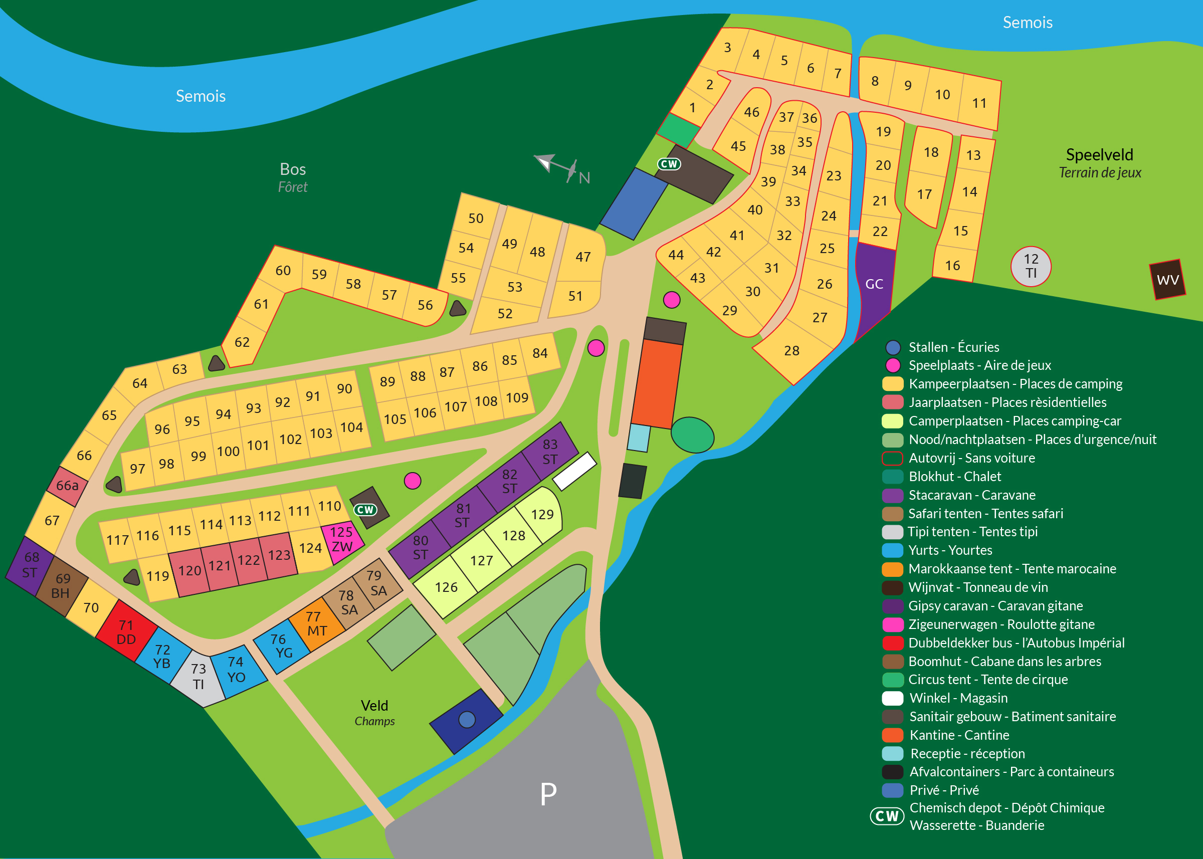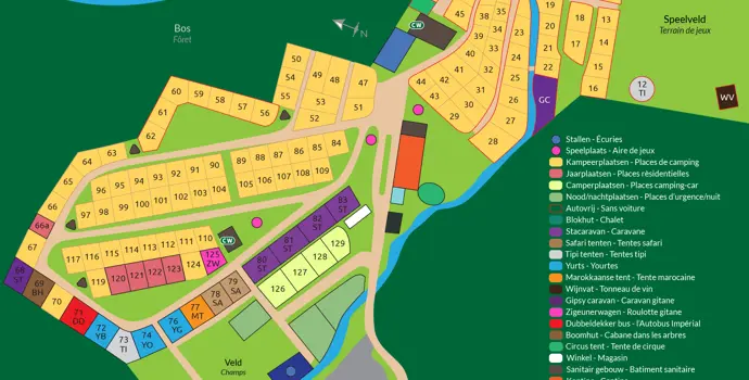 Die geräumigen Stellplätze sind über den parkähnlichen Campingplatz verteilt. Es gibt Plätze entlang des Flusses und auf dem Feld. Vor Ihrem eigenen Zelt können Sie ein Feuer in einem Stahlbehälter entzünden und ein Getränk am eigenen Feuer genießen. Auf dem Campingplatz gibt es auch einige ungewöhnliche und abenteuerliche Unterkünfte zu mieten. Dazu gehören ein Baumhaus, ein Zigeunerwagen und Zigeunerwohnwagen ohne Strom, aber mit Laternen und Kerzen.