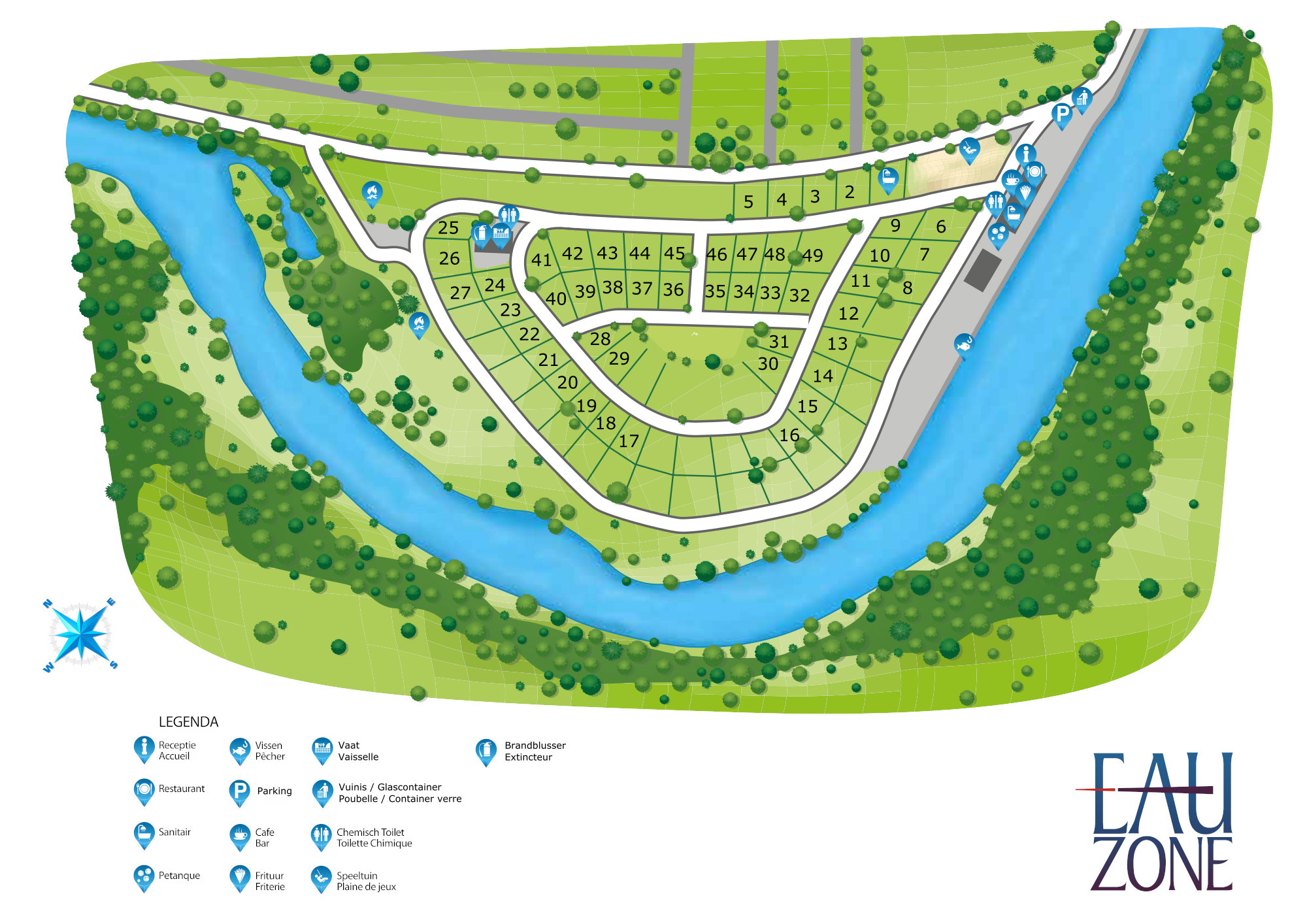 Der Campingplatz Eau Zone liegt am Ufer des Flusses I'Ourthe, wo Sie sich mit einem guten Buch entspannen können. Die 84 Stellplätze sind von viel Grün umgeben und es gibt einige Stellplätze am Fluss.