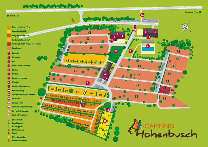 Eingebettet in die deutschsprachigen belgischen Ostkantone, die sowohl den Ardennen als auch der Eifel ähneln, in der Nähe der Stadt St-Vith, ist der Campingplatz Hohenbusch zentral gelegen, in der Nähe von Luxemburg (11 km) und Deutschland (8 km) und vom ANWB mit 4,5 Sternen ausgezeichnet.