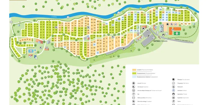Die Stellplätze sind über den gesamten Ferienpark verteilt. Für jeden gibt es den idealen Platz. Möchten Sie in der Nähe des Schwimmbads stehen, bevorzugen Sie die Nähe des Flusses oder möchten Sie einen Blick auf den Spielplatz haben? Alle Stellplätze sind entwässert, um Pfützen nach einem Regen zu vermeiden. Auf dem Campingplatz gibt es auch mehrere Mietunterkünfte. Sie können zwischen einem Mobilheim, einem Lodgezelt oder einem Bungalow wählen.