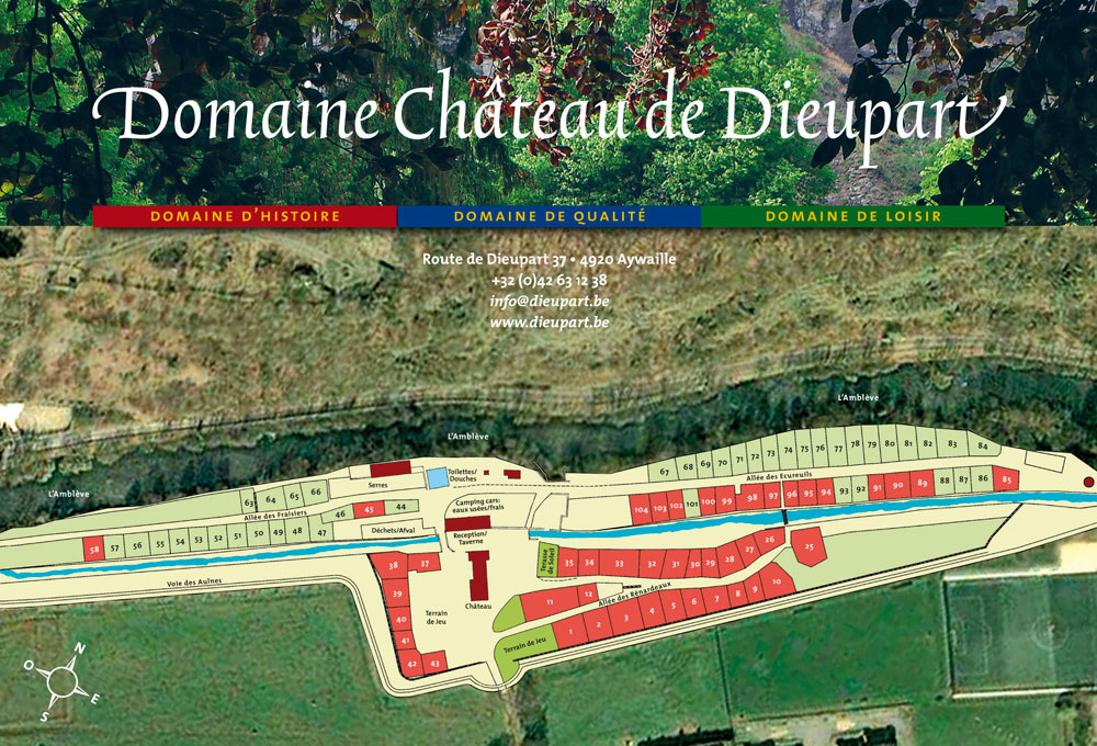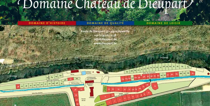 Der Campingplatz Domaine Château de Dieupart liegt am Rande der Stadt Aywaille und entlang des Flusses Amblève. Der Campingplatz befindet sich im Park eines Schlosses aus dem 16. Jahrhundert und verfügt über 108 geräumige Stellplätze am Fluss mit einer Fläche von 100 bis 150 m2.