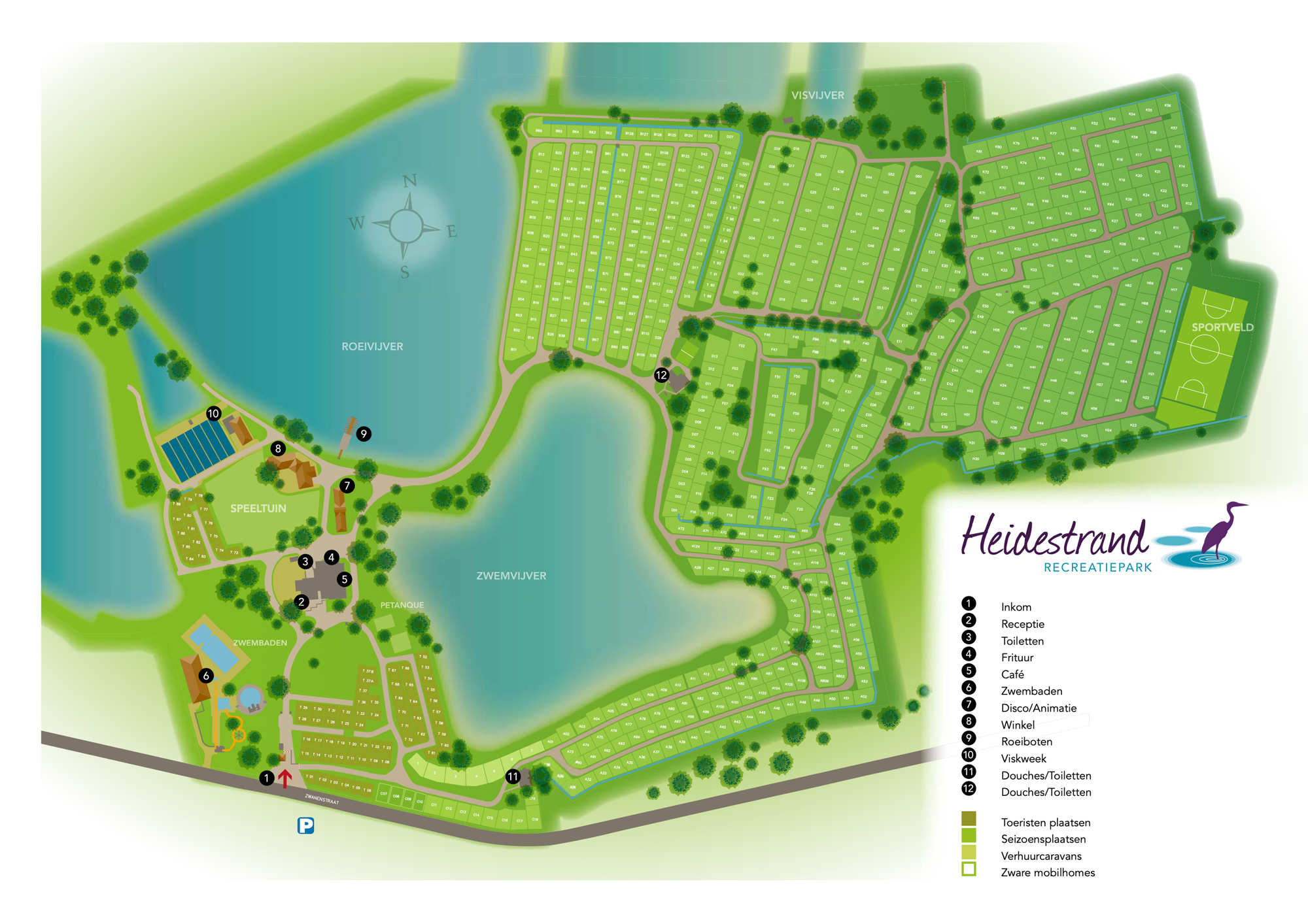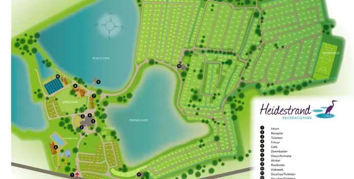 Rund um den Pool gibt es eine Spiel- und Liegewiese, wo Sie sich entspannen können. Der 3 Hektar große, klare Naturteich mit Sandstrand ist das Herzstück von Heidestrand und wird jedes Jahr zum besten Naturteich Limburgs gekürt! Der Campingplatz verfügt auch über einen eigenen Fischteich, in dem Sie fast alle bekannten Süßwasserfische an den Haken bekommen können. Die hauseigene Fischzucht garantiert die größte Auswahl an Karpfen, Hechten und Felchen.