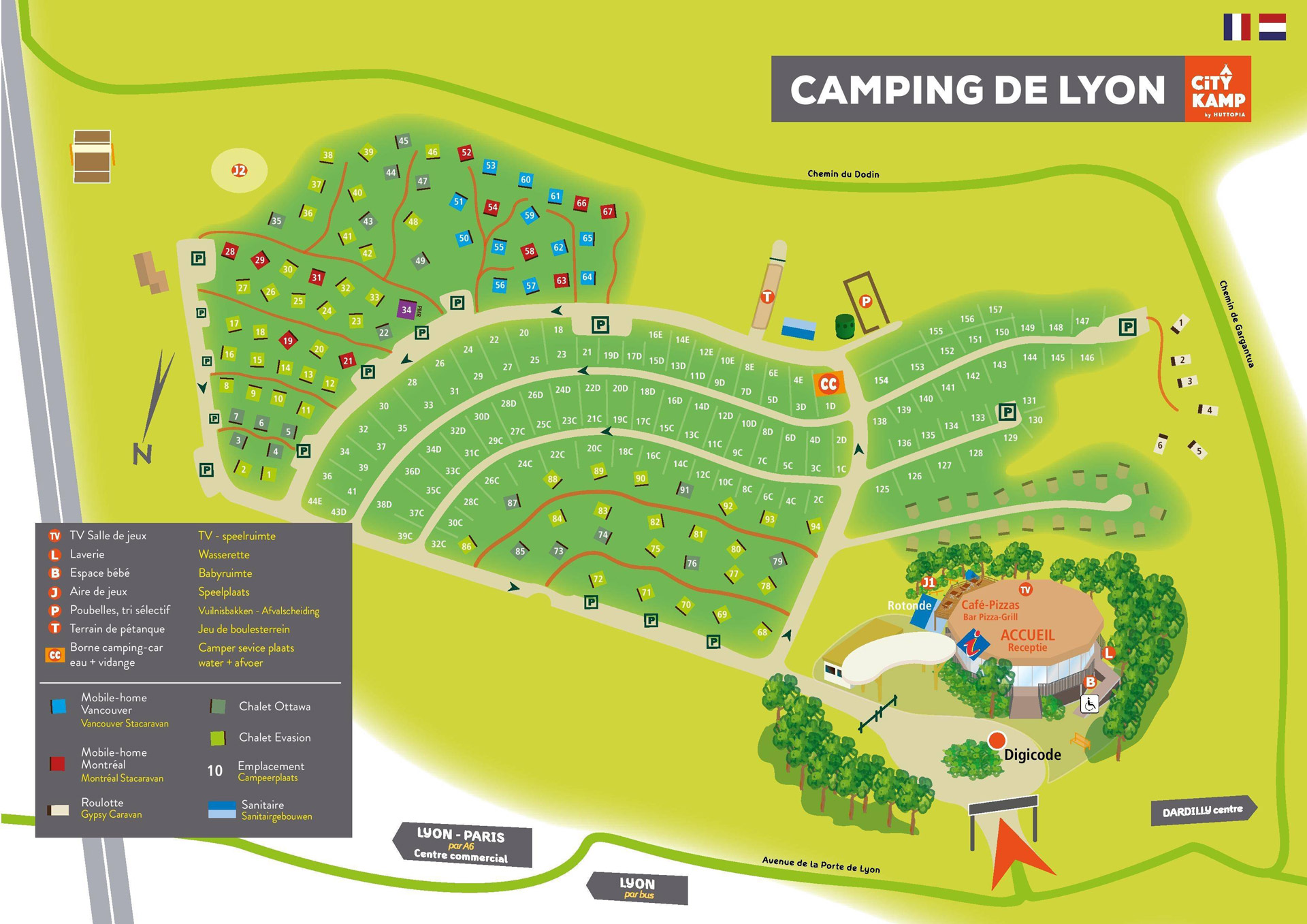Der Campingplatz de Lyon liegt in dem Dorf Dardilly. 10 Minuten vom Campingplatz entfernt finden Sie ein großes überdachtes Einkaufszentrum, wo Sie Ihre Einkäufe erledigen können. Direkt neben dem Campingplatz befindet sich eine Tankstelle. Viel billiger als auf der Route du Soleil zu tanken.