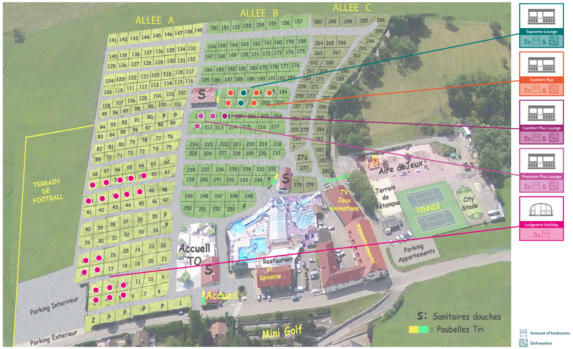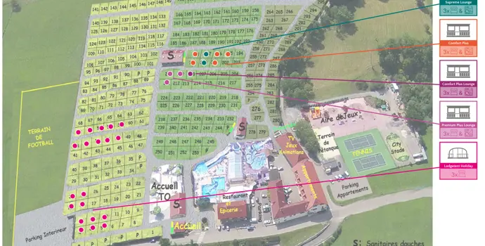 Je kunt dus kiezen waar je wilt gaan zwemmen, vandaag in het meer of blijven jullie op de camping? Ga met z'n allen tegelijk van de waterglijbanen of ga lekker spelen in de waterspeeltuin. Ook handig en vooral gezellig is dat je ook kunt wandelen naar het dorp Lathuile. Maar vergis je niet zowel de omgeving is bergachtig! Ook de camping kent hoogteverschillen en is een zogenaamde terrassencamping. Dit betekent wel dat je vanaf je kampeerplaats kunt genieten van de heuvels en al het groen in de omgeving.