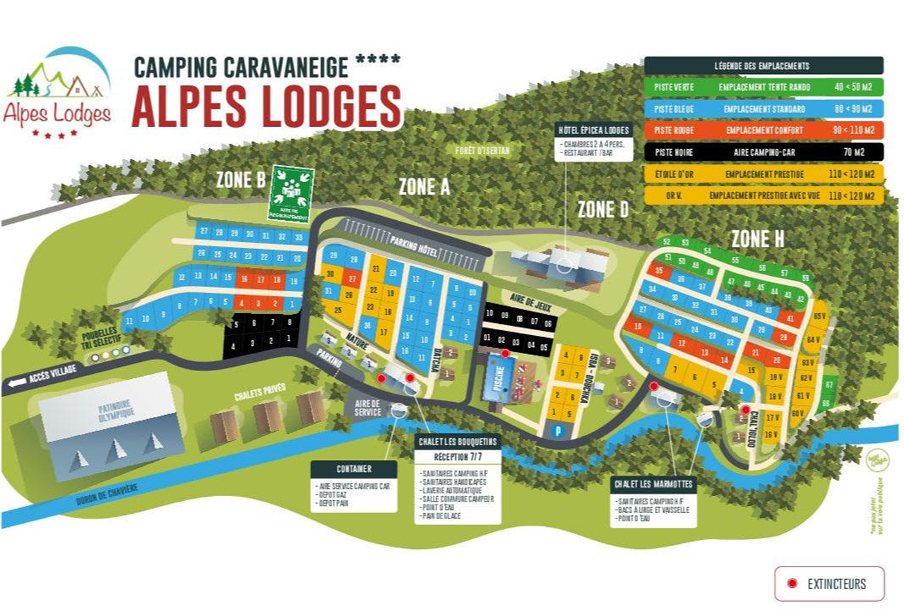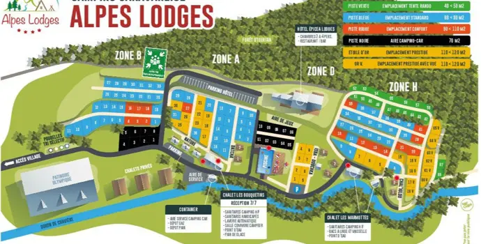 Der Platz verfügt über geräumige Stellplätze für Zelte, Wohnwagen und Wohnmobile sowie über ein vielfältiges Angebot an Mietunterkünften. Sie können zwischen Chalets, Mobilheimen, möblierten Zelten und Roulottes (eine Art Zigeunerwagen) wählen. Das größte Chalet bietet Platz für 8 Personen. In der Nähe gibt es sogar ein Hotel (Epicéa Lodge) für Gäste, die ohne Campingausrüstung übernachten, aber trotzdem die Einrichtungen des Campingplatzes nutzen möchten. Egal, wo Sie sich aufhalten, rundherum haben Sie einen Blick auf die imposanten Berge.