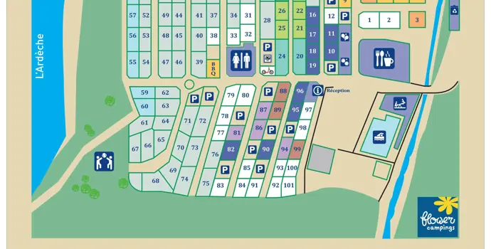 Der Campingplatz liegt in einer Biegung des Flusses Ardeche. Ein enger und ruhiger Abschnitt ohne Kanus. Ein idealer Ort zum Angeln (Forellen). Holen Sie sich vorher eine Erlaubnis an der Rezeption. Und natürlich können Sie auf diesem Abschnitt schwimmen und spielen. Sie können auch im beheizten Außenpool mit Planschbecken schwimmen. Genießen Sie die Sonne auf einem der Liegestühle am Pool.
