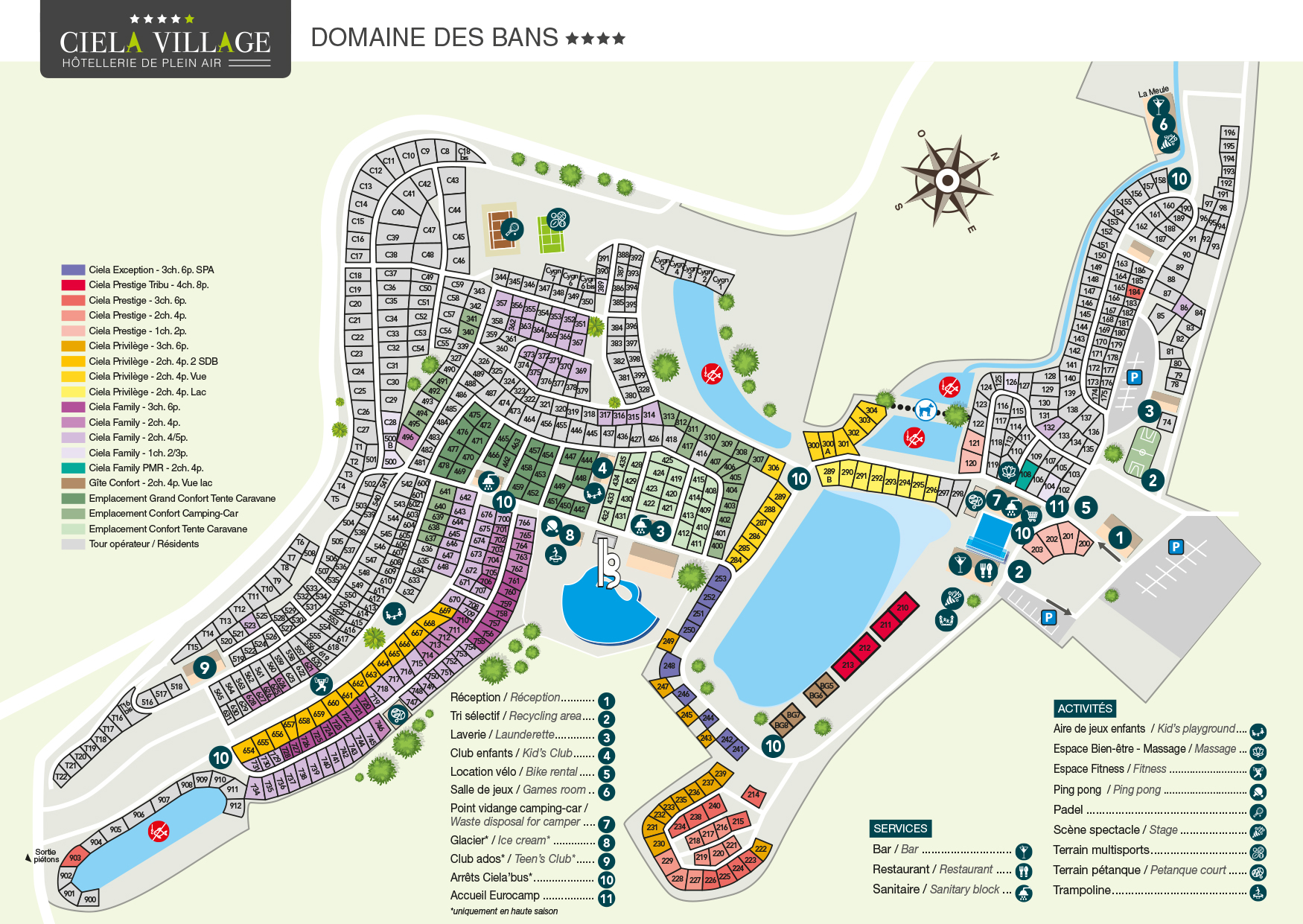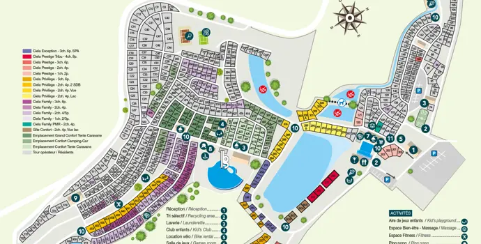Auf dem Campingplatz selbst gibt es reichlich Stellplätze, auch für Wohnmobile und Passanten. Sie haben auch eine große Auswahl an Mietunterkünften. In den Ferienzeiten gibt es ein umfangreiches Freizeitprogramm. Angesichts der Größe des Campingplatzes herrscht dann reges Treiben. Für Jugendliche gibt es eine schallisolierte Disco und eine Spielhalle. Auf dem Platz gibt es viele Möglichkeiten zum Spielen und Sporttreiben. Außerhalb der Hochsaison ist dies auch ein Paradies für Ruhesuchende und Naturliebhaber.