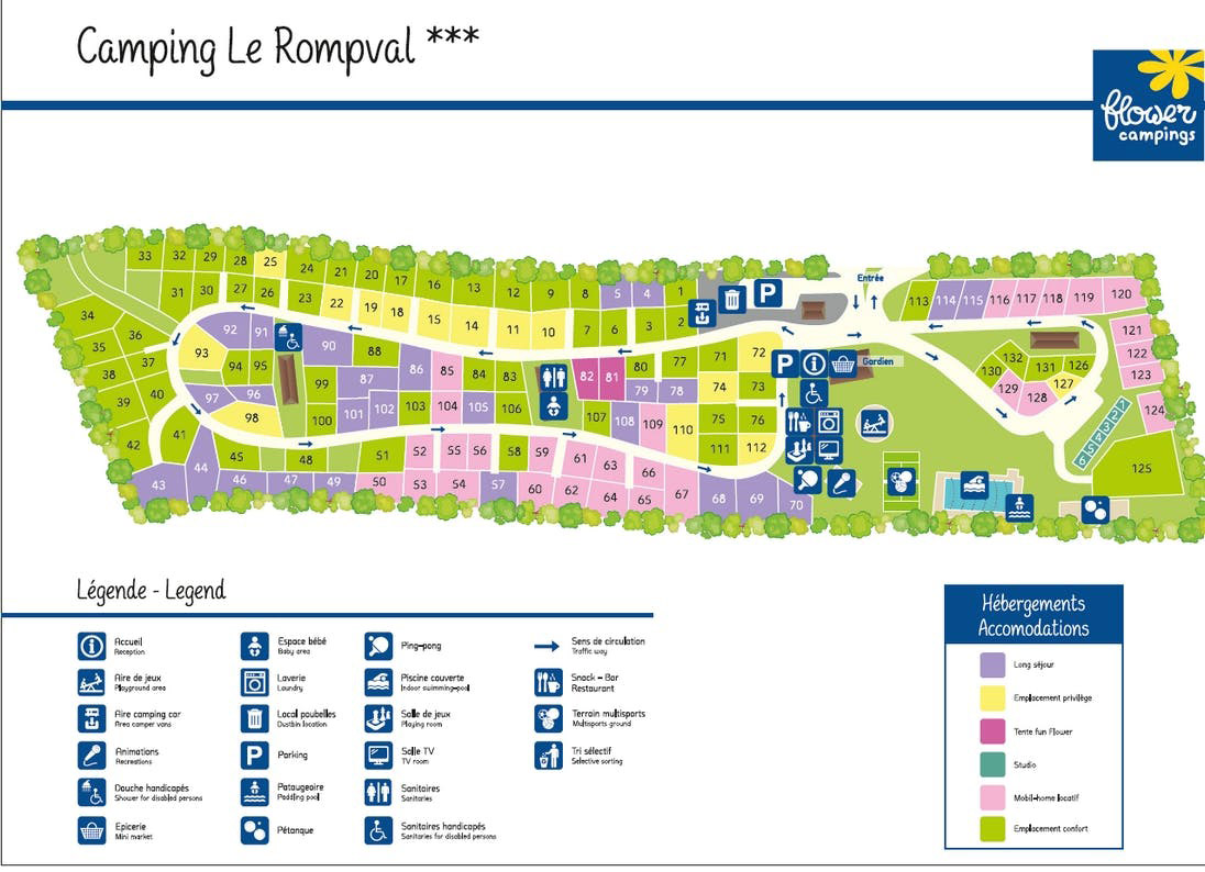 Der Campingplatz Le Rompval kümmert sich sowohl um seine Gäste, die länger bleiben, als auch um die Durchreisenden. Es gibt Wanderhütten für Radfahrer und Wanderer und Stellplätze können auch für eine Nacht reserviert werden. Sie sind auch mit Ihrem Wohnmobil willkommen. Für jeden Geldbeutel gibt es eine Unterkunft oder einen Stellplatz. Von der einfachen Unterkunft ohne eigene Sanitäranlagen bis zum Stellplatz mit eigenen Sanitäranlagen. Die Flower-Camping-Kette achtet auch besonders auf Natur und Umwelt und hat bereits mehrere Auszeichnungen für nachhaltige Freizeitgestaltung erhalten.