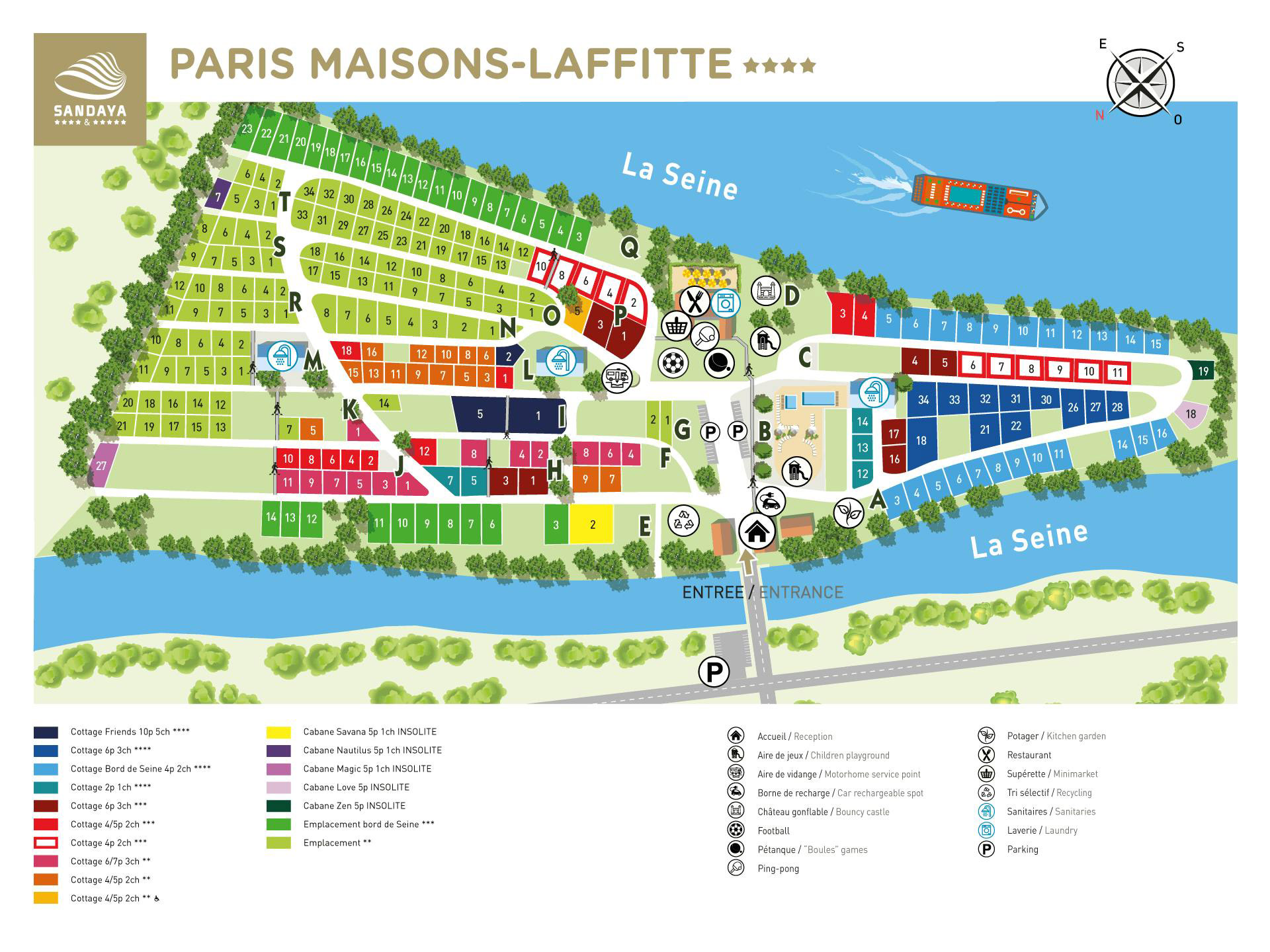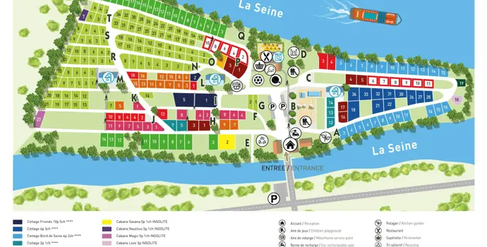 Der Campingplatz bietet seinen Gästen ausreichend komfortable Einrichtungen für einen kurzen oder längeren Aufenthalt. Alle Stellplätze sind mit Strom und Wasser ausgestattet. Sie können auch bevorzugt einen Platz an der Seine reservieren. Es gibt Zelte und Mobilheime zu mieten. Wenn Sie etwas ganz Besonderes wollen, mieten Sie die (Baum-)Hütte auf Stelzen. Hier haben Sie zweifellos die schönste Aussicht über den Campingplatz. Ein weiterer toller Platz auf diesem Campingplatz ist die Terrasse beim Restaurant. Hier haben Sie einen Blick auf die vorbeifahrenden Schiffe auf der Seine.