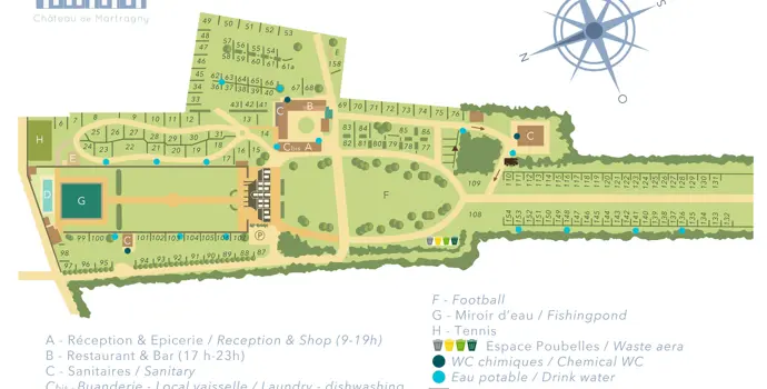 Nach der imposanten, von jahrhundertealten Bäumen gesäumten Auffahrt gelangen Sie zu einem der Nebengebäude des Schlosses aus dem 18. Hier werden Sie herzlich empfangen und zu Ihrem Stellplatz geführt. Es gibt etwa 160 Stellplätze, einige Wohnmobilstellplätze und Mietunterkünfte. Und immer wieder dieser Blick auf das schöne Schloss. Möchten Sie einen ruhigeren Platz mit etwas mehr Schatten? Dann buchen Sie lieber einen Platz am Waldrand. Nach dem Auspacken ist es an der Zeit, den Campingplatz zu erkunden. Englische Gärten und Teiche, was für eine schöne Lage. Ein reichhaltiges Frühstück kann im Schloss gebucht werden. Abends können Sie im großen Innenhof beim Restaurant speisen. Es werden lokale Gerichte, aber auch die leckersten Pizzen serviert.