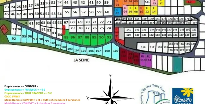 Buchen Sie vorzugsweise einen geräumigen Stellplatz am Wasser. Alle Stellplätze sind mit Wasser und Strom ausgestattet. Dank der niedrigen Hecken, haben Sie die notwendige Privatsphäre, aber immer noch eine schöne Aussicht. Die zu vermietenden Mobilheime mit Veranda haben auch einen Blick auf die Seine. Wussten Sie, dass man in der Seine sowohl angeln als auch Kanu fahren kann? Zwei tolle Aktivitäten auf einmal. Ich habe auch einen schönen Glamping-Tipp für Sie. Auf diesem Campingplatz können Sie auch in einem Tipi-Zelt oder einem Kokosnusszelt übernachten. Für zusätzlichen Komfort mieten Sie einfach einen Babypack.