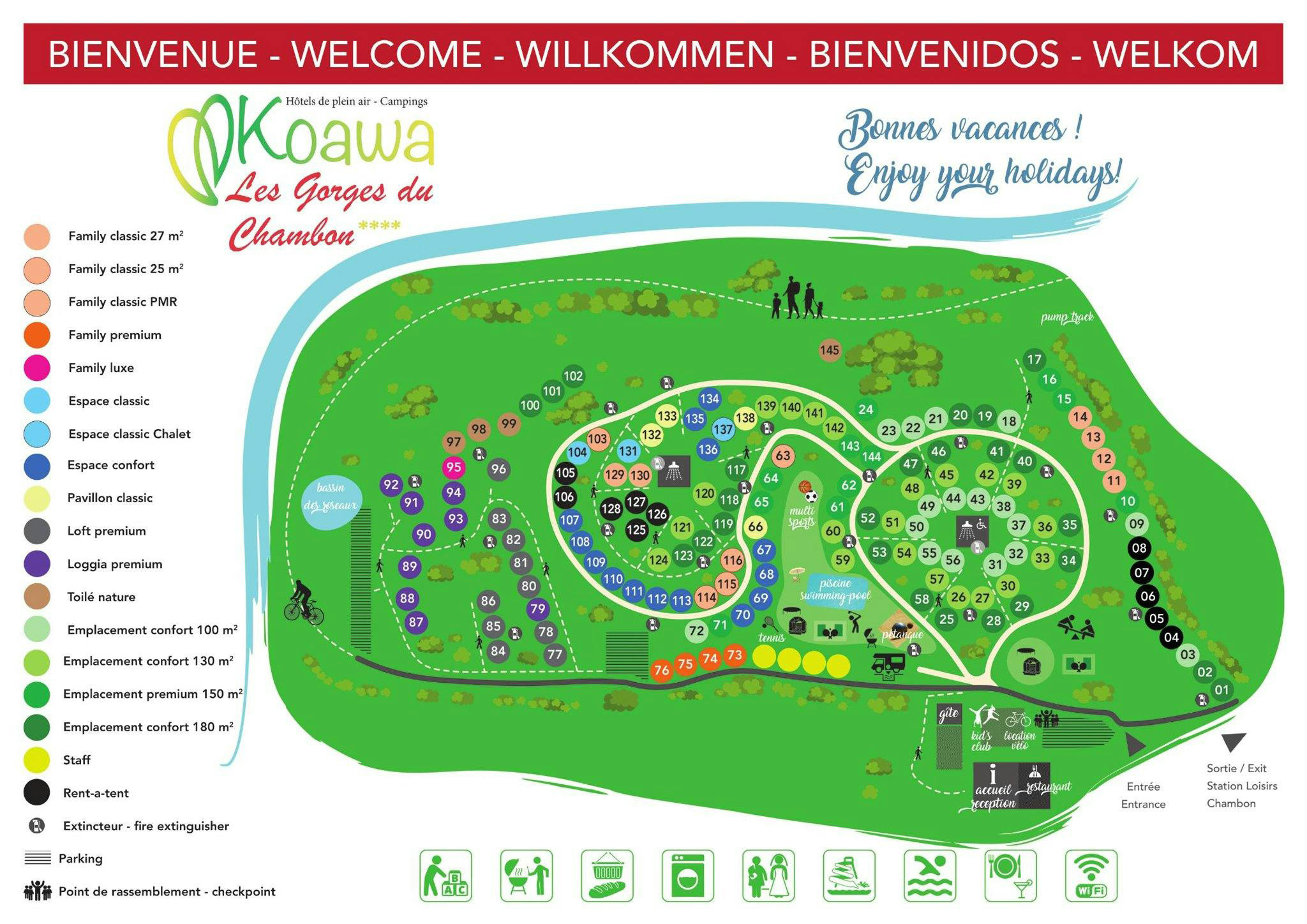 Wie viel Platz Sie hier auf diesem Campingplatz mit über 100 Stellplätzen haben. Sie sind mit Ihrem eigenen Zelt, Wohnwagen oder Wohnmobil willkommen. Campen Sie im Grünen unter den vielen Bäumen, die Ihnen den nötigen Schatten, Privatsphäre und Freiheit bieten. Strom- und Wasseranschluss sind für Ihren Stellplatz, der sehr komfortabel ist, ebenfalls vorhanden. Sie können auch aus einer Vielzahl von Zelten, Chalets und Mobilheimen wählen. Sie wählen selbst, wie viel Luxus Sie wünschen.