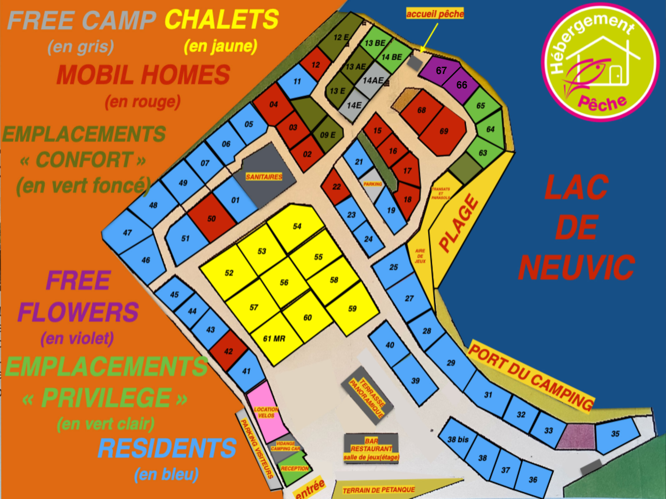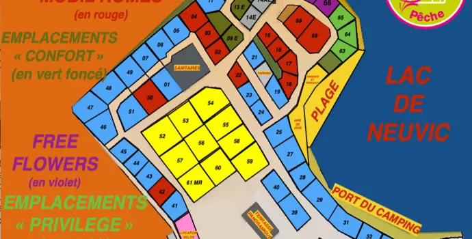 Die Stellplätze des Campingplatzes Le Port de Neuvic sind über ein leicht abfallendes Gelände verteilt, das teilweise mit Bäumen bepflanzt ist, die natürlichen Schatten spenden. Viele Stellplätze liegen direkt am Wasser und bieten einen besonderen Blick und ein einzigartiges Campingerlebnis. Besonders bei denjenigen, die zum Angeln an den See kommen, sind diese Plätze sehr beliebt. Für diejenigen, die etwas mehr Komfort bevorzugen, gibt es Premium-Stellplätze mit eigenen sanitären Anlagen. Außerdem gibt es eine Reihe von Mietunterkünften. Entscheiden Sie sich für ein Bungalowzelt oder lieber für ein Chalet? Egal, wofür Sie sich entscheiden, sie sind komplett ausgestattet und verfügen über eine private Terrasse, damit Sie das Leben im Freien genießen können.