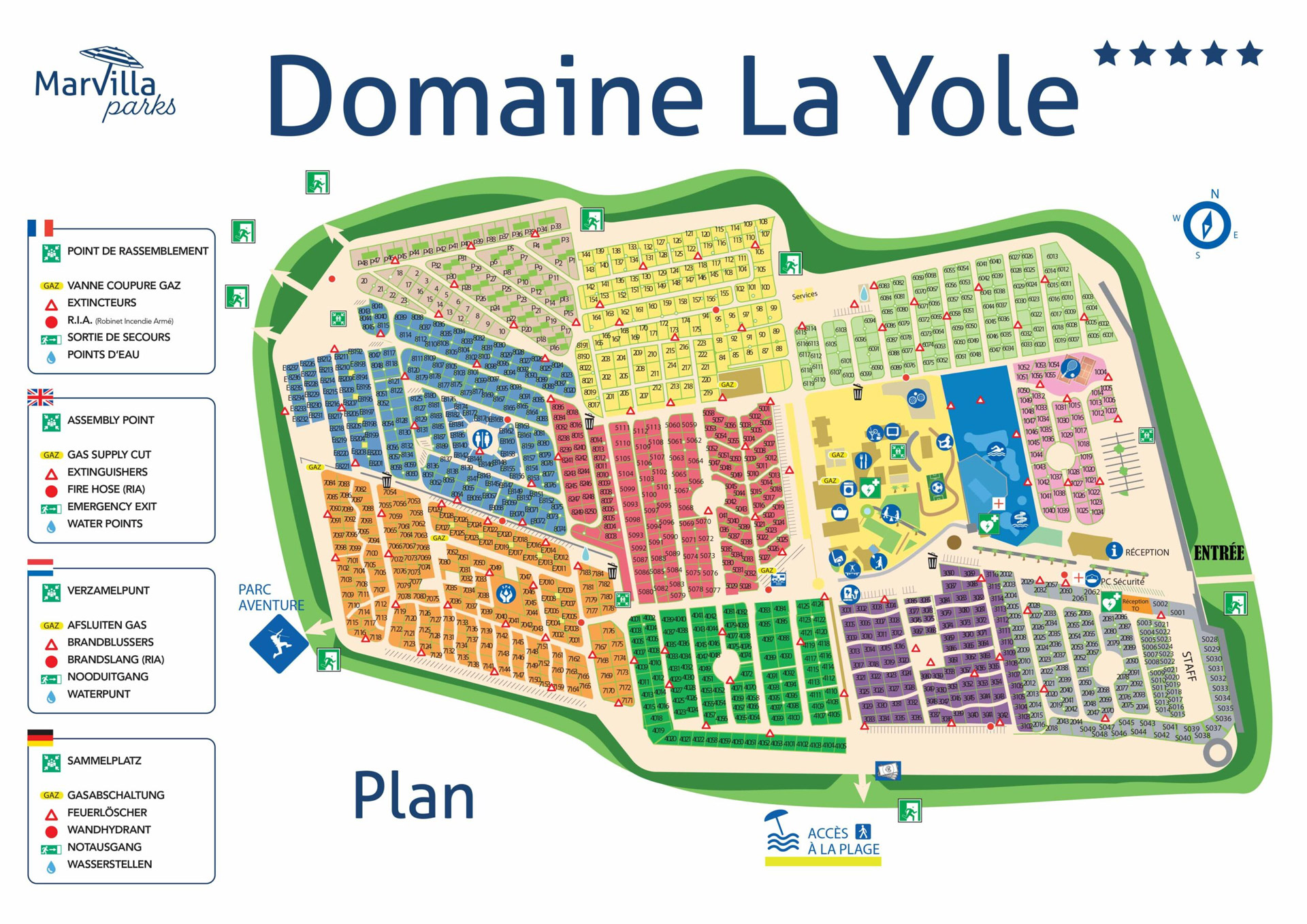 Obwohl es sich um einen Mega-Campingplatz handelt, finden Sie auf den Stellplätzen genügend Ruhe und Privatsphäre. Die üppige Vegetation trägt sicher ihren Teil dazu bei. Ob Sie einen Friseur, eine Bäckerei, eine Eisdiele, einen Metzger oder einen Fischhändler brauchen, alles ist auf dem Campingplatz vorhanden. Auch was die Restaurants betrifft, haben Sie auf der Domaine de la Yole selbst eine große Auswahl. Und das ist auch gut so, denn so haben Sie mehr Zeit für den riesigen Wasserpark. Von der Lagune für Kleinkinder, über den Wasserspielplatz, die neun Riesenrutschen, die Liegewiese und die Poolbar; dieser Komplex ist wirklich groß. In den Schwimmbädern werden auch viele sportliche Aktivitäten angeboten, also melden Sie sich unbedingt an.