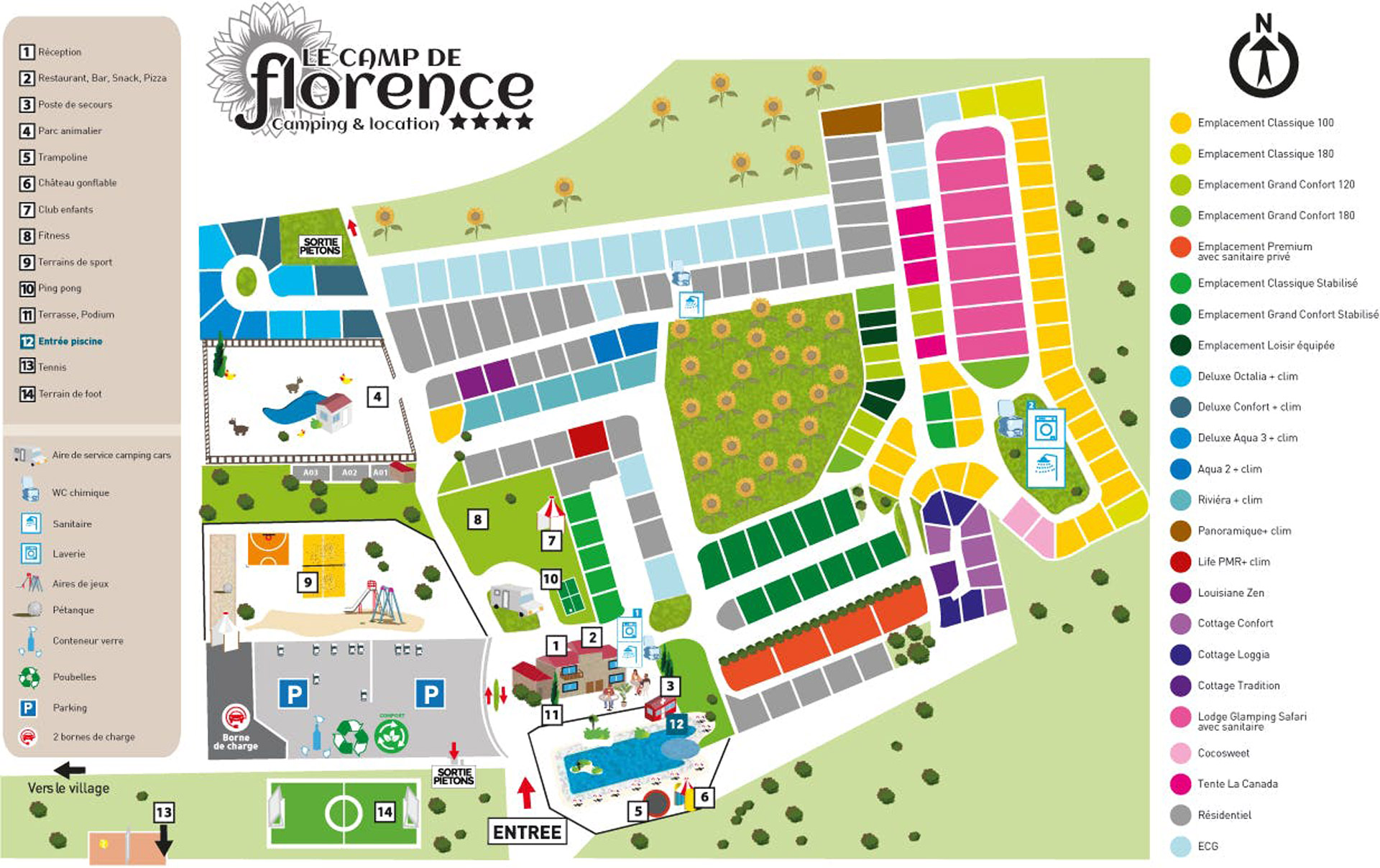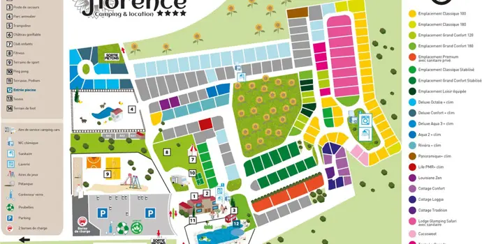 Dies ist ein schöner Ort nicht nur für Kinder, sondern auch für Eltern, Paare, Ruhesuchende und Sportbegeisterte. Alle sind hier herzlich willkommen. Im Le Camp de Florence gibt es noch immer hauptsächlich Campingplätze, aber auch Mietunterkünfte. Wenn Sie als Paar kommen, gibt es maßgeschneiderte Mobilheime, aber auch ein süßes Kokoszelt. Sind Sie eine Familie und möchten Sie etwas Abenteuerliches in einer grünen Umgebung erleben? Dann können Sie ein Safarizelt wählen.