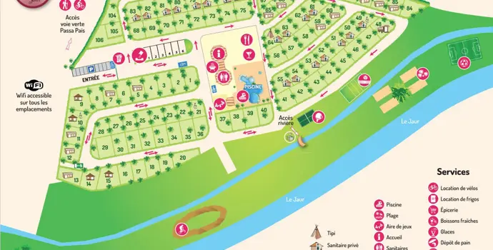 Im Les Cerisiers du Jaur geht es um Entspannung und gemeinsame Erlebnisse. Der beheizte Außenpool mit Whirlpool und separatem Planschbecken lädt zum Wasserspaß ein, während die umliegenden Rasenflächen ideal zum Entspannen mit einem guten Buch sind. Der Fluss Jaur fließt auf der gesamten Länge des Campingplatzes. Sie können vom privaten Sandstrand aus ins Wasser gehen. Das Wasser ist recht flach, so dass Kinder mit viel Spaß Staudämme bauen können. Von hier aus kann man auch den Wasserfall sehen, was ein tolles Fotomotiv ist. Es gibt auch Sport- und Spieleinrichtungen wie Volleyballnetze, Boule-Bahnen und Tischtennisplatten, und in der Hochsaison bietet ein begeistertes Animationsteam lustige Aktivitäten, kreative Workshops und unterhaltsame Themenabende an. Auch was das Essen und Trinken angeht, wird es Ihnen an nichts fehlen. Vom frischen Baguette am Morgen bis zum Cocktail am späten Abend vor dem Schlafengehen. Im Juli und August können Sie zweimal pro Woche an einer Weinverkostung teilnehmen. Dabei lernen Sie die lokalen Weine kennen.