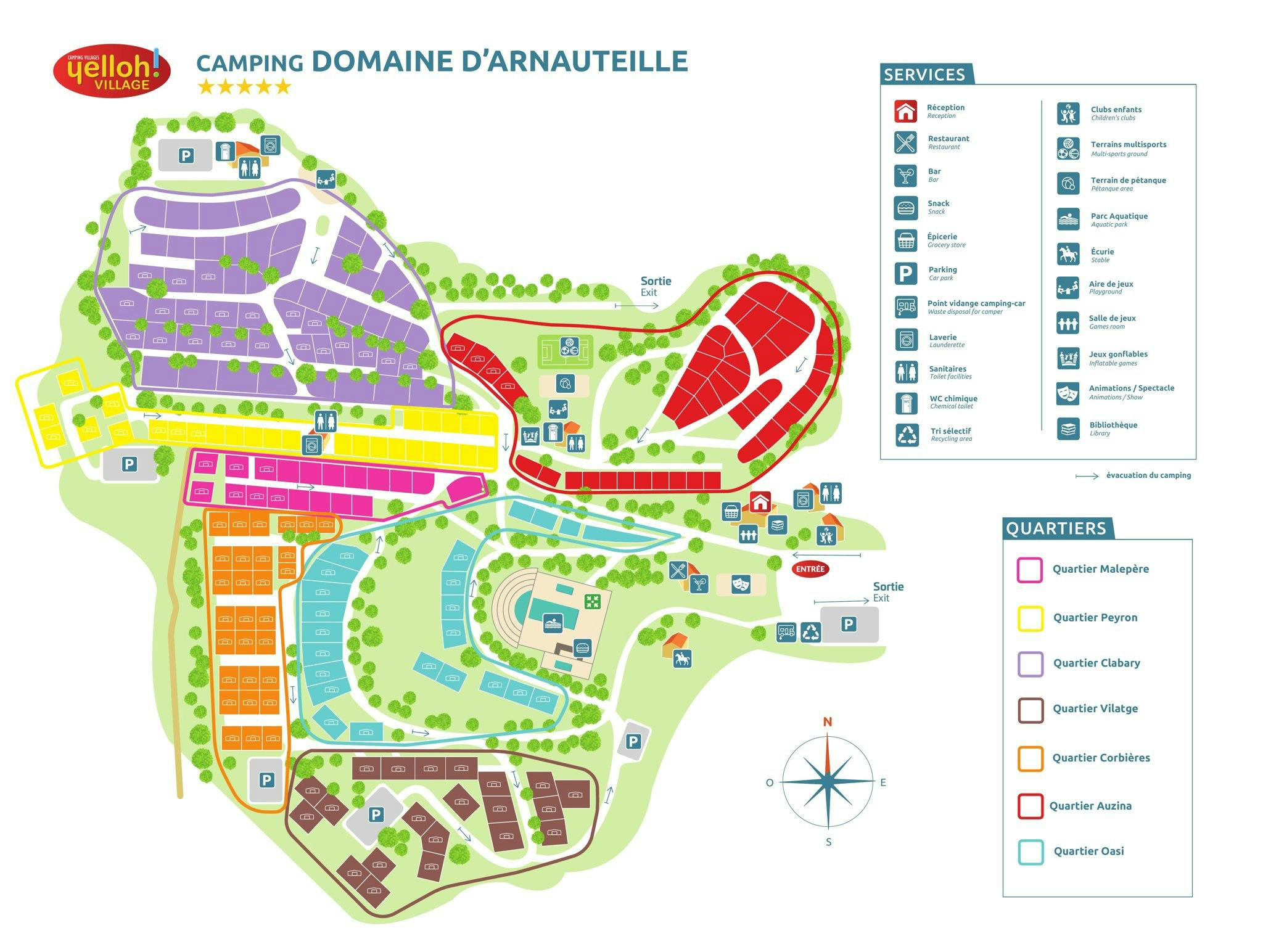 Auf der Domaine d'Arnauteille ist für jeden etwas dabei. Der Aquapark ist eine echte Attraktion: ein schöner Poolkomplex im griechisch-römischen Stil mit mehreren Becken, einem Fluss mit Gegenstromanlage, Whirlpools und einem Planschbecken für die Kleinsten. Stundenlanger Wasserspaß ist garantiert und der Stil fügt sich in die Landschaft ein. In den ehemaligen Stallungen finden Sie außerdem eine Bar und ein Restaurant, ideal für einen Snack und ein Getränk nach einem Tag im Freien, einen kleinen Laden für die täglichen Einkäufe und sogar Wellnesseinrichtungen. Auch für Kinder gibt es Unterhaltung und viel Platz zum Spielen im Freien. Es gibt Spielplätze, Sportplätze, Reitmöglichkeiten auf dem Campingplatz und ein traditionelles Boule-Spiel.