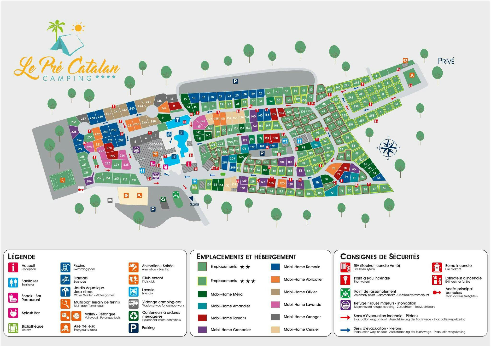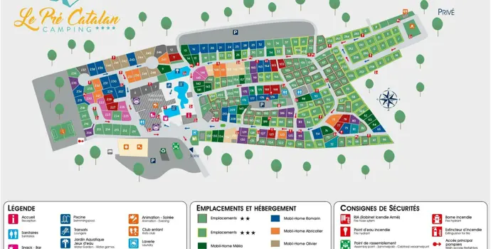Le Pre Catalan ist ein großer Fünf-Sterne-Campingplatz mit viel Animation und Unterhaltung. Vom frühen Morgen bis zum späten Abend gibt es hier viel zu erleben. Mit Bäckerei, Supermarkt, Bibliothek, Waschsalon und mehreren Restaurants und Bars wirkt er manchmal wie ein Dorf im Kleinen. Die Splash-Bar am Pool ist sehr zu empfehlen, ebenso wie der englische Pub. Schauen wir uns den Aquapark an. Ein etwa 500 m² großer Park mit beheizten Becken, Whirlpool, Planschbecken und spektakulären Rutschen bietet endlosen Wasserspaß. Und das, obwohl das Meer nur 1,5 Kilometer vom Campingplatz entfernt liegt. Tagsüber organisiert das begeisterte Animationsteam Spiele, Sportwettbewerbe und kreative Aktivitäten, während Sie abends in der gemütlichen Froggy's Bar Live-Musik, Karaoke oder Themenabende genießen können. Es gibt Kinderclubs, die in verschiedene Altersgruppen unterteilt sind, wobei die Teenager natürlich nicht vergessen werden.