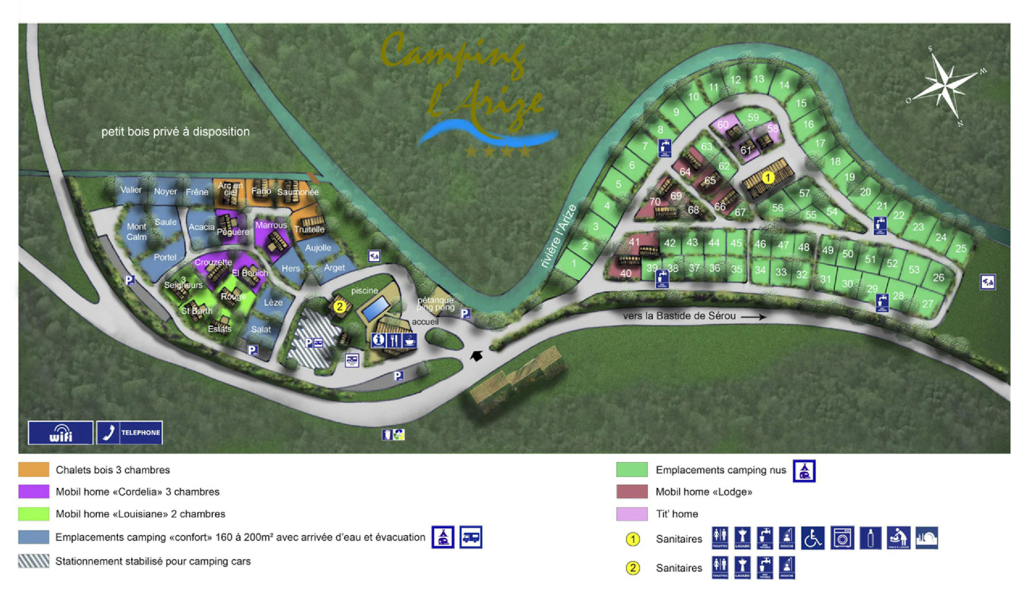 Der Fluss Arize fließt am Campingplatz vorbei. Man kann nicht wirklich darin schwimmen, da er zu seicht ist, aber das macht es für die Kinder besonders lustig. Sie können im Fluss spielen, paddeln oder angeln. Und dann ist da noch das beheizte Schwimmbad des Campingplatzes mit separatem Kinderbecken. Jede Menge Wasserspaß. Außerdem ist der Kinderclub für Kinder bis zu 12 Jahren immer gut besucht. Hier treffen sie sich mit Gleichaltrigen und machen viele Bastel- und Sportangebote. Auch die anderen Gäste kommen nicht zu kurz; die netten Themenabende und Sportturniere werden immer gerne angenommen. Für einen Snack und ein Getränk gibt es die Bar, den Brötchenservice und einen kleinen Campingplatzladen.