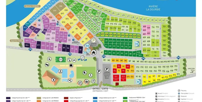 Was die Campingarten betrifft, so hat man auf diesem Campingplatz die Qual der Wahl. Es gibt geräumige Stellplätze für Ihr Zelt, Ihren Wohnwagen oder Ihr Wohnmobil oder Sie können eine Unterkunft mieten. Es gibt Bungalows oder Mobilheime und auch für größere Familien gibt es geeignete Unterkünfte. Eine gute Mischung aus Camping und Vermietung, die die Campingatmosphäre noch verstärkt. Sträucher, Hecken und andere Grünpflanzen sorgen für Privatsphäre und Schatten. Die Aussicht auf die Umgebung ist wunderschön, hügelig, grün, unberührt; es gibt jedes Mal etwas Neues zu sehen. Vom Campingplatz aus haben Sie einen direkten Zugang zum Fluss. Hier gibt es einen Kieselstrand, aber Sie können sich auch auf oder am Wasser vergnügen.