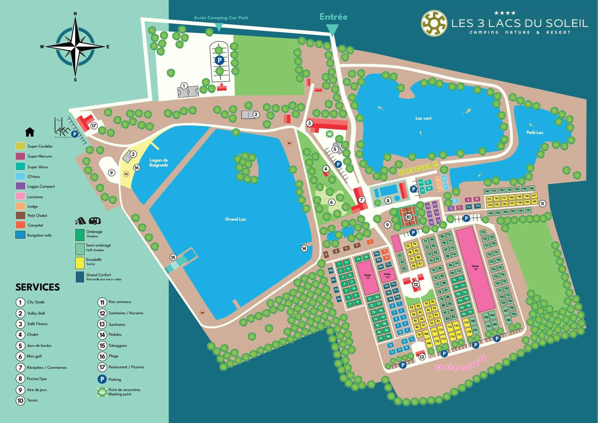 Tagsüber herrscht auf dem Campingplatz reges Treiben! Das Angebot wird Ihre Urlaubstage automatisch ausfüllen. Die drei Seen laden zum Schwimmen, Schwimmen, Angeln oder einfach nur zum Faulenzen auf einem Handtuch am Ufer ein. Das Schwimmbad mit Rutschen ist die Domäne von begeisterten Kindern, die sich immer wieder auf die Rutschen wagen. Das Animationsteam bietet Malvormittage, Sportturniere, Tanzabende und Bastelnachmittage an. Von der gemütlichen Bar mit ihrer Terrasse aus blickt man auf das Wasser. Sehen Sie den schönen kleinen Strand dort drüben mit Spielgeräten und Duschen? Vielleicht etwas für morgen? Es gibt auch einen 2,5 Kilometer langen Trainingsweg um einen der Seen. Seien Sie einfach eine Zeit lang sportlich. Das Restaurant serviert die leckersten lokalen Gerichte.