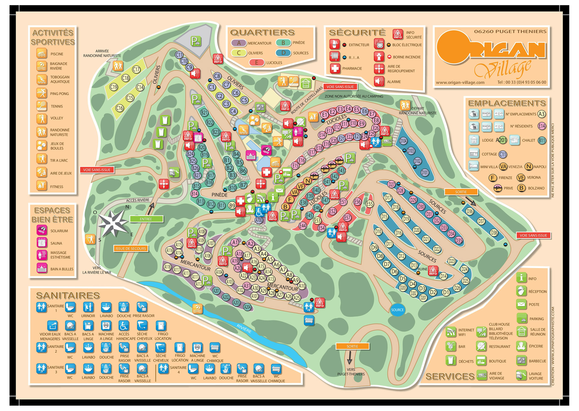 Wie bereits erwähnt, befindet sich dieser Campingplatz im Südosten Frankreichs. Der Platz erstreckt sich über 35 Hektar. Und weil es sich um einen Terrassencampingplatz handelt, haben Sie rundherum freie Sicht. Unter Ihnen der Fluss Var und weiter weg die Gipfel der Alpen. Mit seinen beheizten Schwimmbädern, der Sauna, dem Hammam, den Massagen und dem Whirlpool fällt er auch unter die Rubrik Wellness-Campingplatz. Dazwischen eine schöne Mischung aus Campingplätzen und der Möglichkeit, Zelte und Chalets zu mieten. Dies ist auch ein echter FKK-Campingplatz, auf dem Kinder willkommen sind. Sie rutschen die Wasserrutsche im Schwimmbad hinunter, es gibt ein separates Kinderbecken und in den Sommerferien auch Kinderanimation.