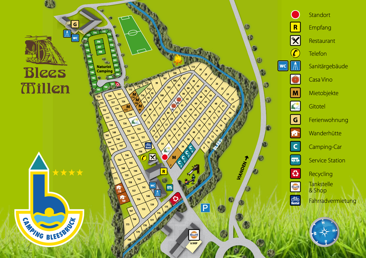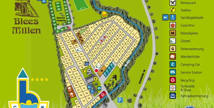 Der Campingplatz Bleesbruck liegt am Fuße der Ardennen am Fluss Blees. Dieser Campingplatz ist parkähnlich angelegt und verfügt über einen separaten FKK-Bereich mit 28 Stellplätzen. Einige der 184 textilen Stellplätze liegen am Fluss und es gibt sonnige und schattige Stellplätze.