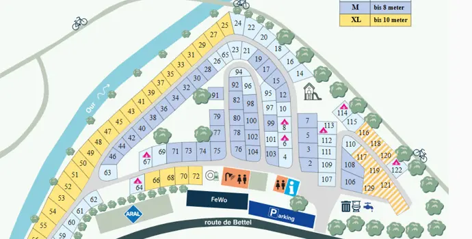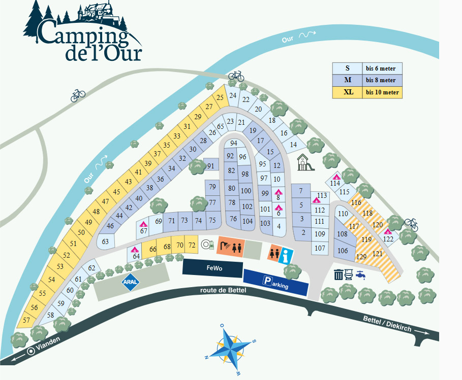 Finden Sie den idealen Platz unter den 108 geräumigen Stellplätzen auf dem Camping de l'Our. Diese großzügigen Stellplätze (zwischen 90 und 120 m²) befinden sich sowohl in der Sonne als auch im Schatten am Fluss Our, in der Mitte des Campingplatzes entlang der Bäume.