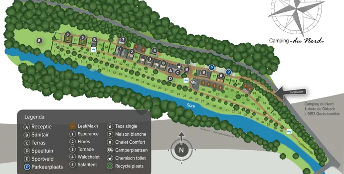 Der Campingplatz Du-Nord liegt im Herzen der Luxemburger Ardennen, an der Sauer im ruhigen Naturpark Obersauer in Goebelsmühle. Die waldreiche Umgebung und die schönen, unberührten Flussgebiete machen ihn zum idealen Ziel für Wanderer, Radfahrer, Angler und Motorradfahrer.