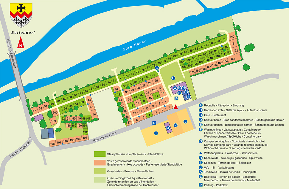 Die Kinder können schwimmen, im Fluss oder auf dem Spielplatz spielen und in der Hochsaison gibt es ein Unterhaltungsprogramm. Etwa 10 km vom Campingplatz entfernt liegt die malerische Stadt Vianden, umgeben von Naturschönheiten. Der Sessellift bringt Sie auf 450 Meter Höhe und Sie können die Aussicht auf die Stadt und den Fluss Our genießen.