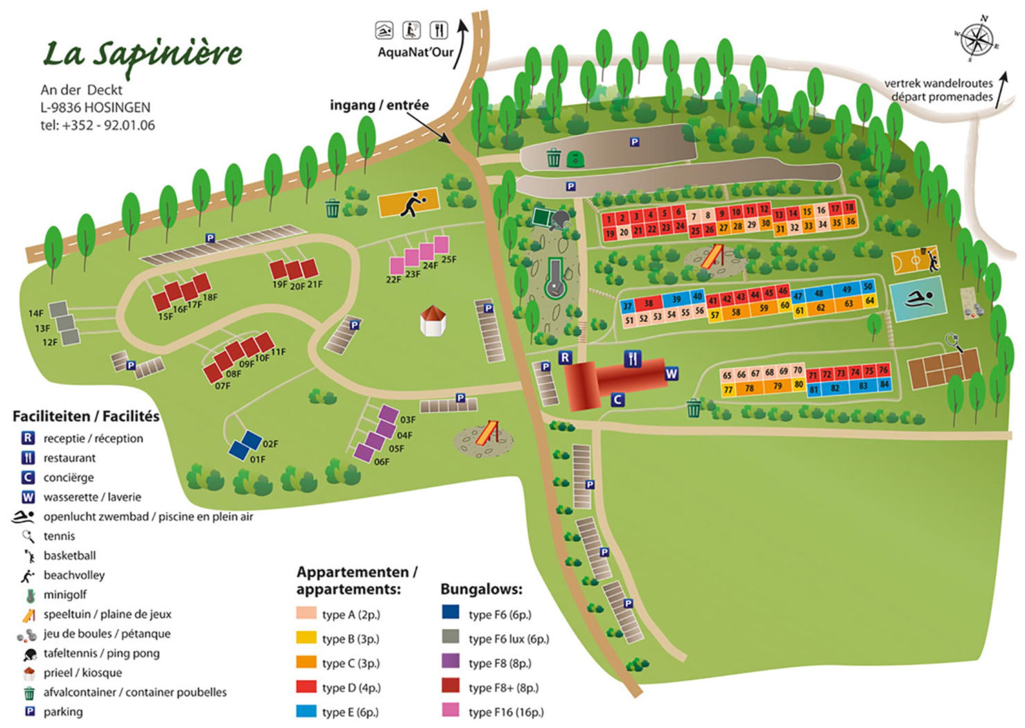 An der Rezeption wird auch Niederländisch gesprochen, eine schöne Idee! Auf der Domaine La Sapiniere können Sie zwischen Wohnungen und Bungalows wählen. Die Anlage ist klein und autofrei, so dass Kinder sicher spielen können. In den Ferien gibt es auch ein Unterhaltungsprogramm. Je nach Zusammensetzung können Sie zwischen Wohnungen für 2, 3, 4 oder 6 Personen wählen. Die Bungalows sind für 6 und 8 Personen verfügbar und es gibt auch einen großen Familienbungalow für 16 Personen. Alle Unterkünfte sind modern eingerichtet und verfügen, je nach Typ, über verschiedene Extras wie Kamin, Soundbar oder Whirlpool. In einigen Unterkünften sind Hunde erlaubt.