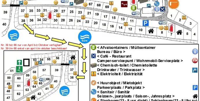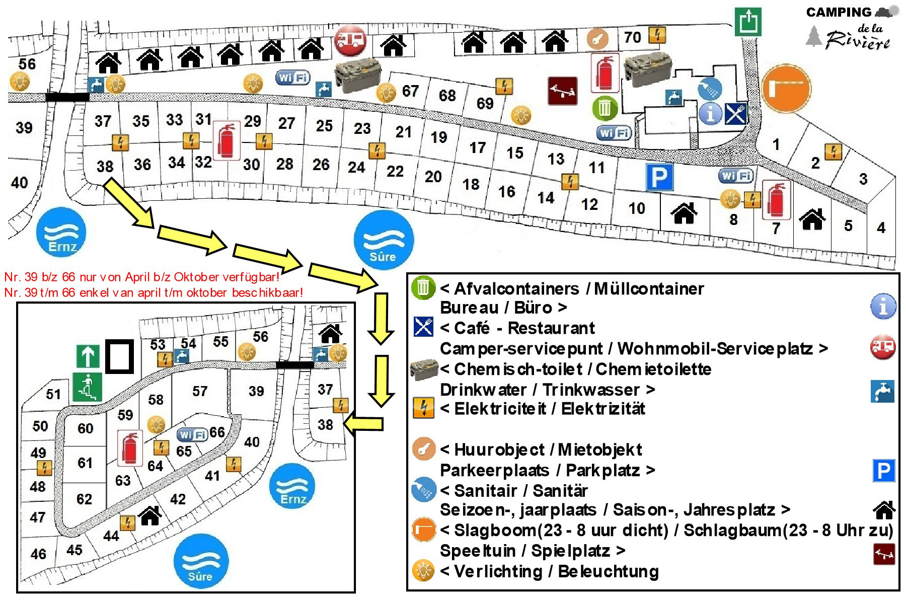 Der Campingplatz de la Rivière liegt am Fluss Sûre in der Gemeinde Reisdorf. Die 67 Stellplätze sind ebenerdig und von Bäumen, Sträuchern und Fliesen abgegrenzt. Es gibt einen kleinen Spielplatz für die Kinder und einen Spielraum mit Airhockey und Tischfußball.