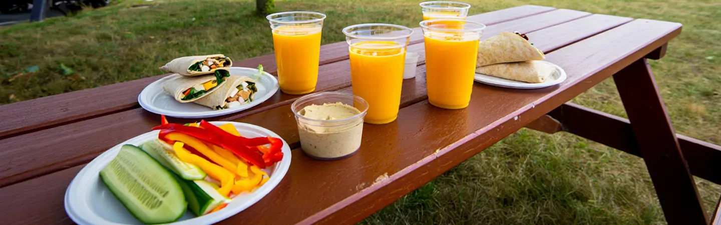 Paprikastreifen, Kirschtomaten, Gurkenscheiben und Möhrenstifte knabbern sich im Auto lecker und gesund. Einfach waschen und in Tüten oder Schalen verpacken. Sie brauchen sie für einen Zwischenstopp? Dann können Sie einen weiteren leckeren Dip mitnehmen. Eine Schale mit Hummus, Tzaziki oder Kräuterfrischkäse zum Beispiel. Sie reisen in mehreren Tagen? Dann schneiden Sie das Gemüse für den zweiten und dritten Tag auf dem Übernachtungscampingplatz oder im Hotel. So bleibt es schmackhafter.