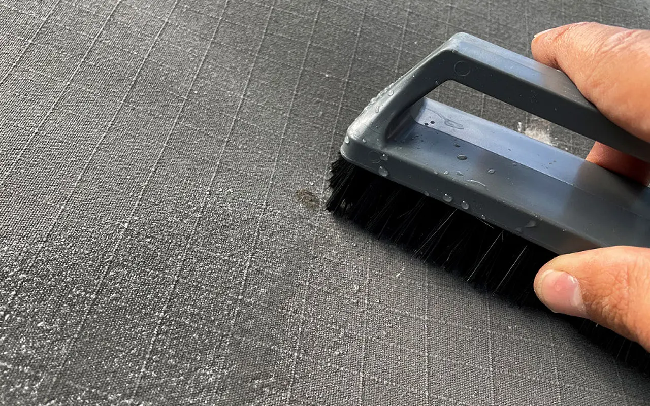 Bevor Sie mit dem Imprägnieren beginnen, sollten Sie Ihr Tuch zunächst gründlich reinigen. Tun Sie dies mit einer trockenen (weichen) Bürste. Vergewissern Sie sich, dass Sand, Zweige und anderer Schmutz vollständig entfernt sind. Dann reinigen Sie den Stoff mit Wasser. Am einfachsten geht das mit einem Gartenschlauch. Lassen Sie den Stoff anschließend gründlich trocknen, bevor Sie ihn imprägnieren.