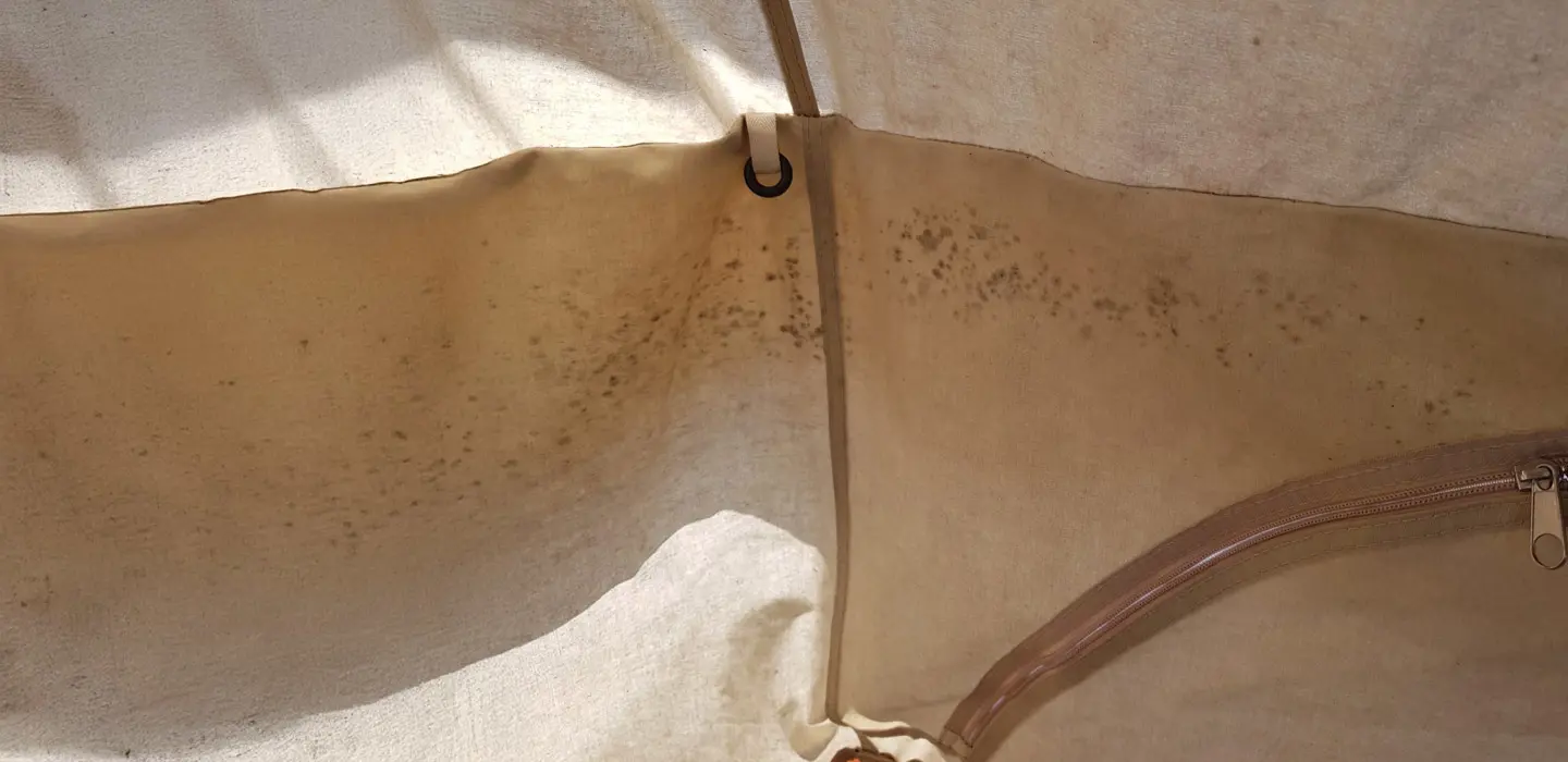 Vielleicht unnötig zu erwähnen, aber Schimmel entsteht durch Feuchtigkeit. Wenn Sie Ihr Zelt nicht richtig trocknen lassen, d. h. es nass lagern, entsteht Schimmel. Schimmel ist ein Mikroorganismus, der an warmen, feuchten Orten mit wenig Belüftung gedeiht. Schimmelpilze verbreiten sich über Sporen und verwandeln Ihr Zeltgewebe in kürzester Zeit in eine Leinwand voller schwarzer, grüner oder grauer Flecken. Außerdem riecht er sehr muffig. Schimmelpilze wachsen nicht nur auf Baumwolle, sondern auch auf synthetischen Materialien wie Polyester oder Nylon.