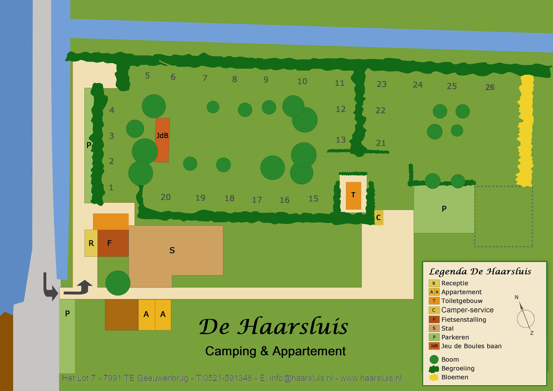 Der Campingplatz verfügt über 25 geräumige Stellplätze im Grünen, die sich auf zwei Felder verteilen. Auf dem größten Platz befindet sich eine Boulebahn. Das Sanitärgebäude wurde kürzlich renoviert. Um die Ruhe und den Frieden in dieser schönen Umgebung voll genießen zu können, ist der Campingplatz autofrei. Die 2 Wohnungen am Rande des Campingplatzes können das ganze Jahr über gebucht werden. Sie sind für 2 bis 4 Personen geeignet und bieten einen Blick auf den Obstgarten und den Kanal mit seinen vorbeifahrenden Booten.