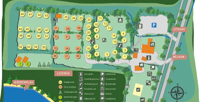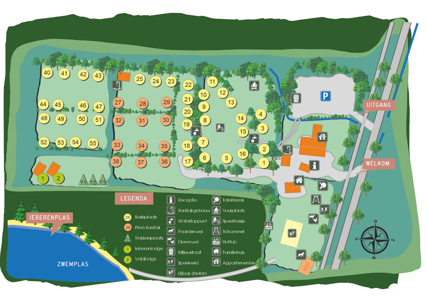 Auf diesem natürlich reizvollen, autofreien Campingplatz finden Sie etwa 50 Stellplätze, die auf mehrere Felder verteilt sind. Wählen Sie vorzugsweise das Feld mit einem Spielplatz, einen Stellplatz mit privaten Sanitäranlagen oder etwas ganz anderes in der Nähe der Pferdeweide. Schließlich können Sie auf diesem Campingplatz Ihr eigenes Pferd mitbringen! Die Kinder werden wahrscheinlich früh aufstehen, so dass sie ihre Brötchen im Voraus besorgen können (zum Mitnehmen) und um 9.30 Uhr beim Füttern der Tiere auf der Wiese helfen können. Die Kinder beobachten auch gerne die Pferde in der Pferdetränke oder treffen sich auf der Spielwiese. Auf der Spielwiese finden Sie verschiedene Spielgeräte, eine Tischtennisplatte und gute Fußball- und Volleyballmöglichkeiten.