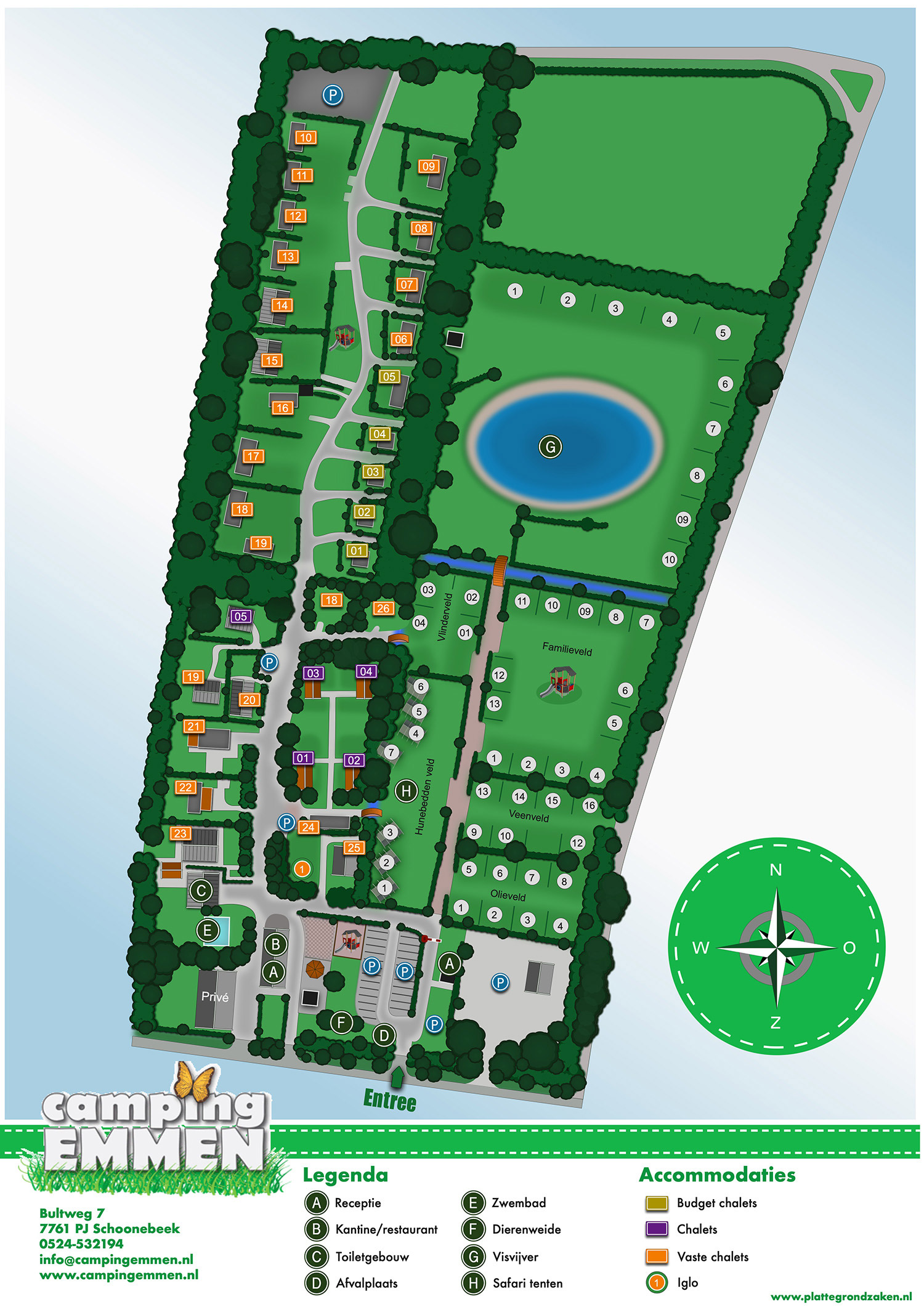 Vom Traktorzelt über das Wohnmobil bis zum Luxus-Chalet. Auf Camping Emmen kann jeder kommen und das Leben in der Natur und die Gemütlichkeit genießen. In ländlicher Umgebung und doch in der Nähe des Dorfzentrums von Schoonebeek finden Sie diesen mittelgroßen, aber gemütlichen Campingplatz in Süd-Drenthe. Auf dem Campingplatz selbst gibt es viel zu erleben, aber auch der Wildlands Zoo ist gleich um die Ecke. Auch das ist einen Besuch wert.