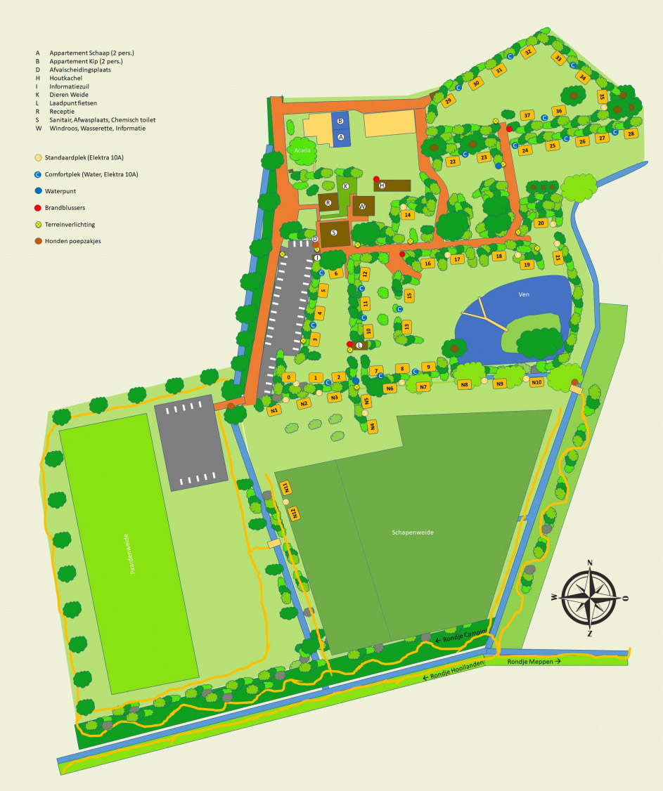 Ein schöner, charmanter Campingplatz am Rande des Dorfes Meppen in Drenthe. Mit einem schönen kleinen Teich in der Mitte des Campingplatzes und vielen Pflanzen, Wildblumen und Bäumen. Der Campingplatz ist beliebt bei Ruhesuchenden, Naturliebhabern und Menschen über 50 Jahren. Der Campingplatz vermietet auch Wohnungen, die das ganze Jahr über reserviert werden können.