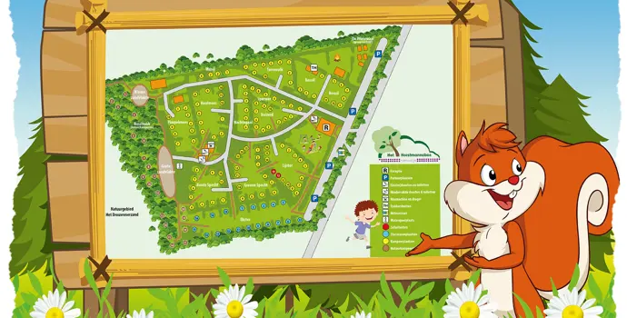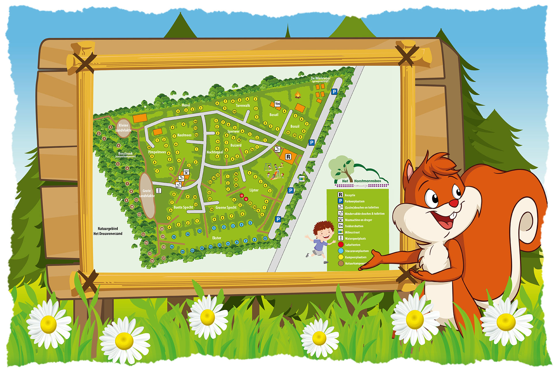 De kampeerplaatsen op deze boscamping bij het Drouwenerzand liggen op open velden, omgeven door bomen, sommige plaatsen van elkaar gescheiden door bosschages. De natuurkampeerplaatsen bevinden zich in het bos nabij een zandverstuiving.