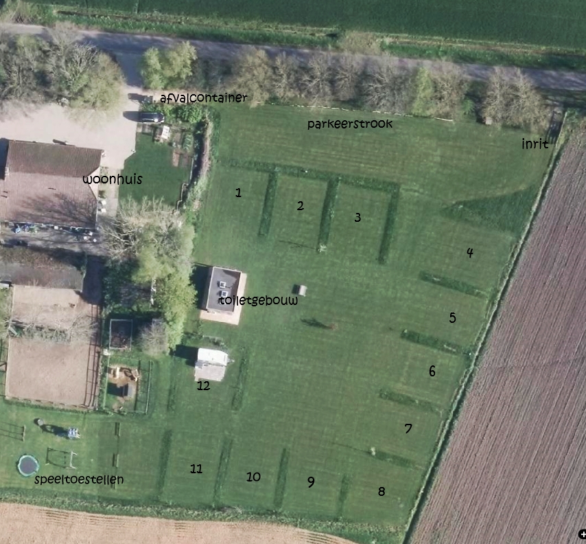 Der Campingplatz liegt in einem Ackerland, auf dem abwechselnd Mais, Kartoffeln oder Knollen-/Zwiebelpflanzen angebaut werden. So kann man in einem Jahr in alle Richtungen blicken und im nächsten steht der Mais vielleicht schon ein paar Meter hoch. Auf der Südseite des Geländes befinden sich zehn Hektar Grünland für die Silage. Die Sicht ist immer frei und es gibt keine Kühe, Pferde oder Schafe. Dafür kann man viele Vögel und manchmal Hasen oder Bussarde beobachten. Je nach Jahreszeit kommen auch Rehe vorbei.