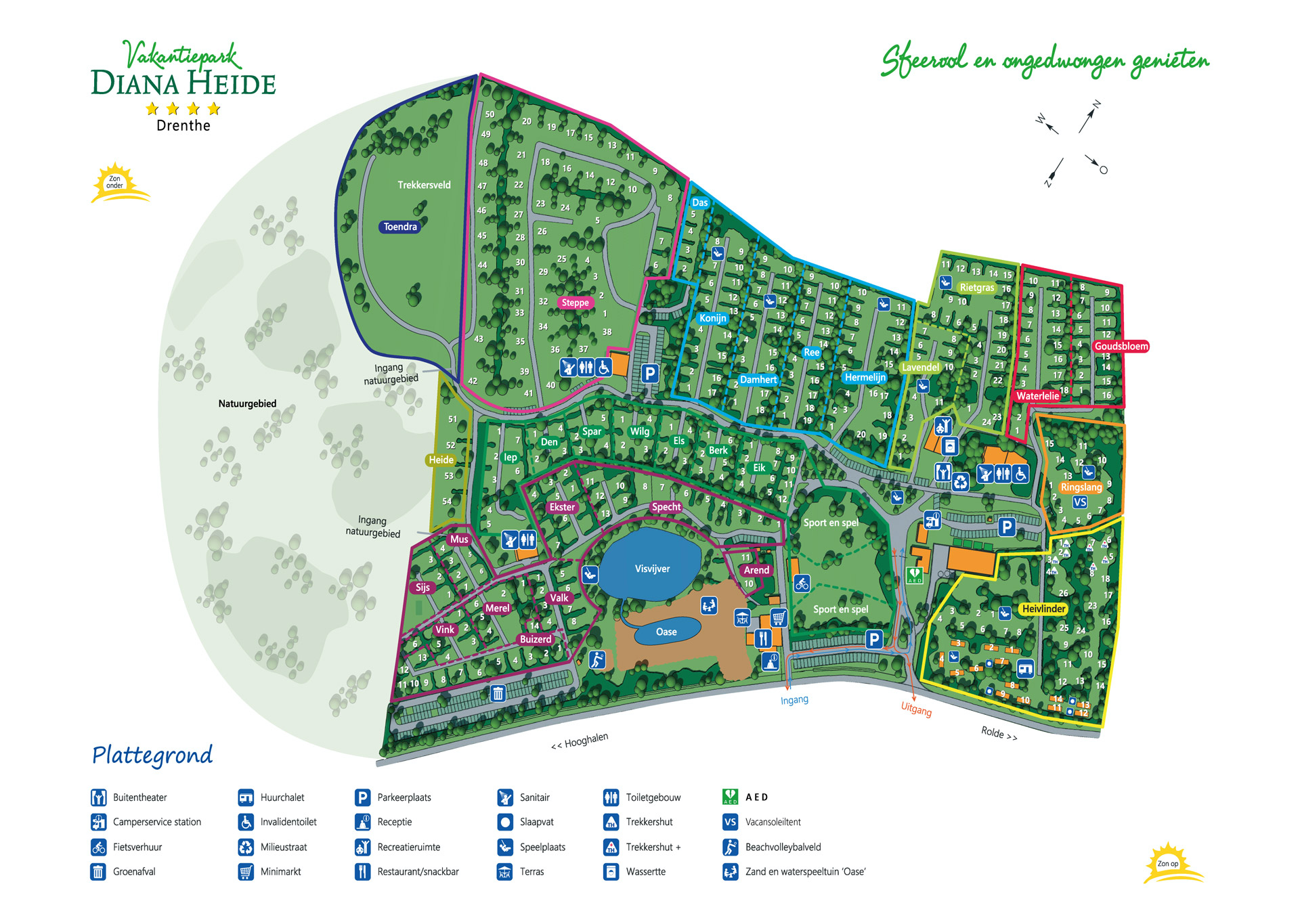 Gemütlicher Familiencampingplatz in Drenthe. Der Ferienpark Diana Heide liegt am Rande des Nationalparks Drentsche Aa. Der Campingplatz ist geräumig mit einem Spiel- und Angelteich und bietet Stellplätze im Wald und auf offenen Feldern. Der ideale Ort für Naturliebhaber, denn vom Park aus können Sie verschiedene Wander- und Radwege nutzen.