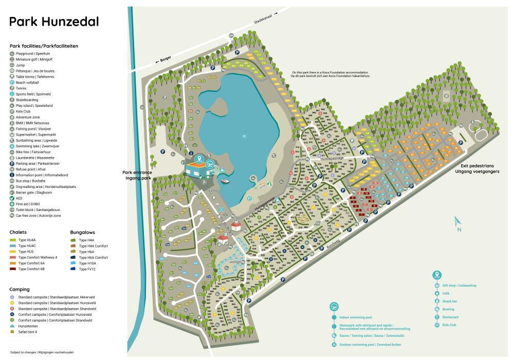 Das Zentralgebäude mit allen Einrichtungen und dem Schwimmbad liegt direkt am Freizeitsee. Hier kannst du jeden Tag viele coole Aktivitäten machen. Wie wäre es mit Laserspielen, Tretbooten, dem Paddelplatz oder der Kletterwand? Wenn es regnet, kannst du den Indoor-Spielplatz besuchen oder bowlen gehen. Das Freizeitteam hat zusammen mit Koos Konijn ein attraktives Programm für Jung und Alt zusammengestellt. Die meisten Aktivitäten können nach vorheriger Anmeldung kostenlos besucht werden. Neben der Entspannung im Schwimmparadies können Sie sich auch für einen Nachmittag in der Sauna und im türkischen Dampfbad entscheiden. Was für ein Vergnügen auf dem Campingplatz Hunzedal! Der innere Mensch wird nicht vergessen, was bei einem Campingurlaub sehr angenehm ist. Der Supermarkt bietet eine große Auswahl, aber auch die Pizzeria, die Snackbar oder das Buffetrestaurant sind eine attraktive Option.