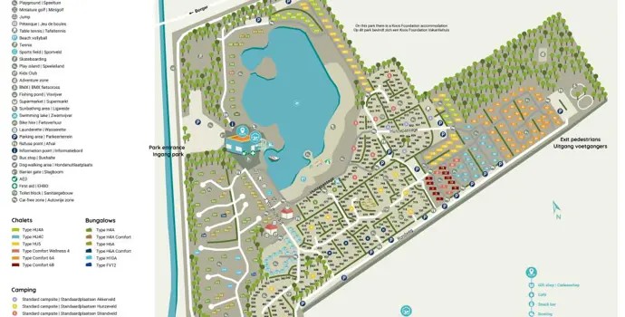 In diesem vielseitigen Ferienpark können Sie zwischen Standard- und Komfort-Campingplätzen wählen. Außerdem gibt es eine große Auswahl an Mietunterkünften, die spielerisch zwischen den Campingfeldern liegen. Die Safarizelte, Glam-Lodge-Zelte und blauen Bungalowzelte sind komplett ausgestattet und verfügen über einen eigenen Küchenblock. Sie nutzen die sanitären Anlagen auf dem Campingplatz. Kostenloses Wifi ist auf dem gesamten Campingplatz verfügbar.