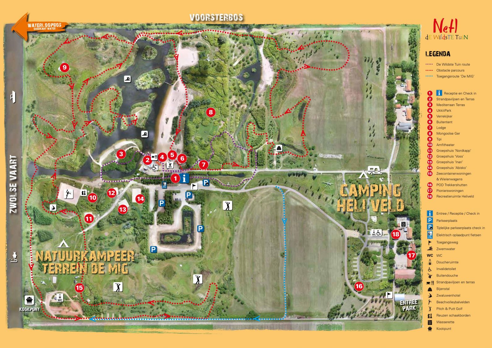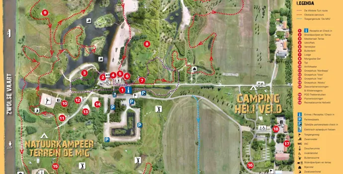 Der Natuurkampeerterrein de MIG verfügt über 5 Wohnmobilstellplätze mit weitem Blick über die Polderlandschaft und 30 geräumige Zeltstellplätze entlang der Zwolse Vaart. Die Zeltplätze sind autofrei und in der Nähe steht ein robustes MIG-Jagdflugzeug als Wahrzeichen. In der Nähe der Zeltplätze gibt es hier und da kleine Kräutergärten. Pflücken Sie neben Ihrem Zelt frische Kräuter für eine Tasse Tee, eine Suppe oder ein anderes hausgemachtes Gericht. Feuer ist erlaubt, hier und da gibt es Topfkocher für den allgemeinen Gebrauch, und Holz ist in der Nähe des Sanitärgebäudes erhältlich.