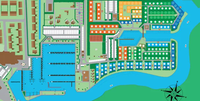 Der Campingplatz ist grün angelegt und von Wasser umgeben. Es herrscht eine ruhige Atmosphäre mit der zusätzlichen Gemütlichkeit von Wasser und Wassersport. Der Leiter des Campingplatzes ist auch Hafenmeister und reserviert Ihnen gerne einen Platz im angrenzenden Jachthafen. Außerdem gibt es einen umfangreichen Bootsverleih. Es gibt Stellplätze direkt am Wasser, wo Sie auch Ihr eigenes Boot festmachen können.