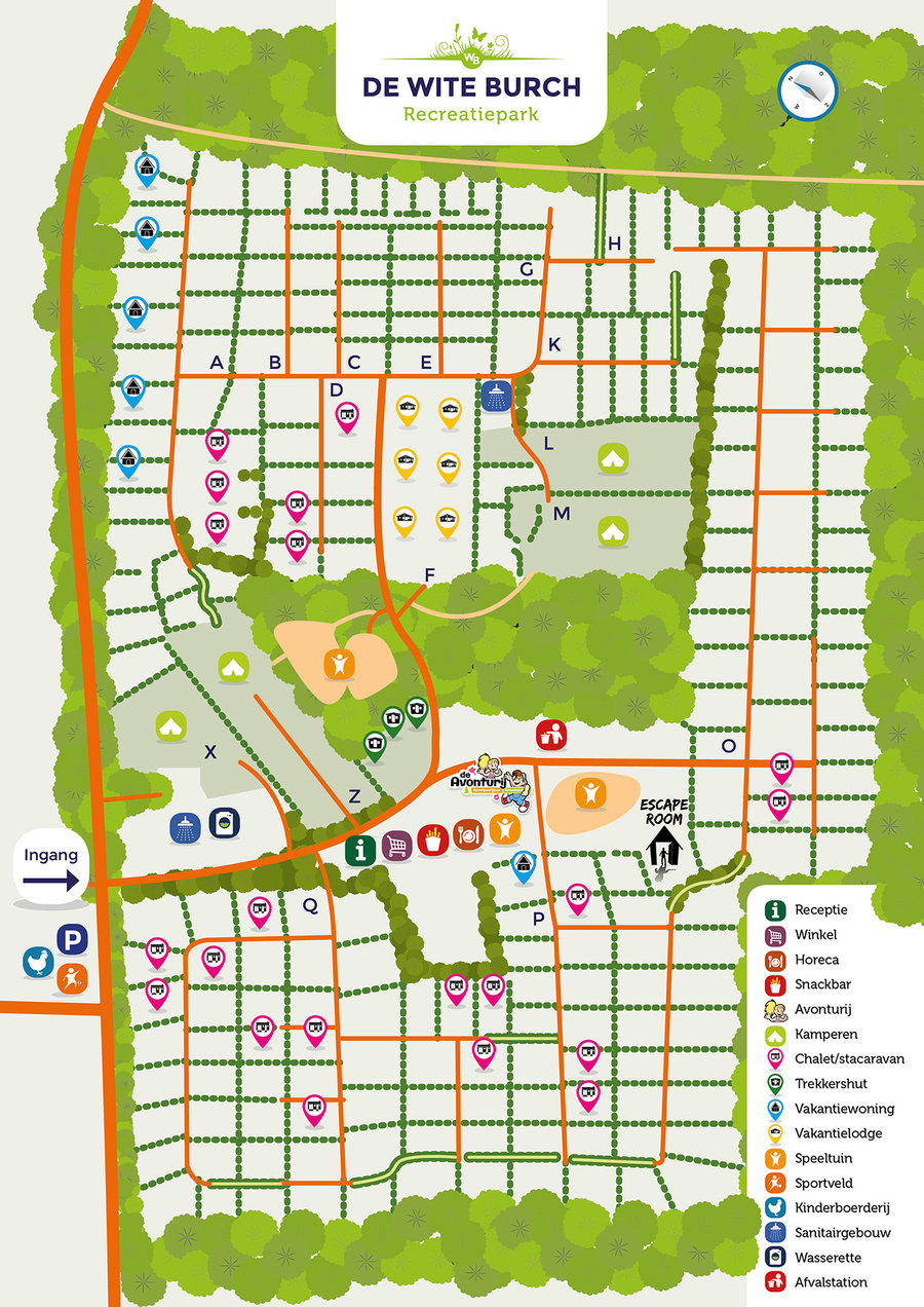 Auf de Wite Burch herrscht eine freundliche, ruhige Atmosphäre. Der Campingplatz selbst ist von viel Grün, Wald und natürlichem Wasser umgeben. Es gibt überwiegend feste Stellplätze und etwa sechzig Plätze für Touristencamping. Diese Plätze befinden sich auf geschützten Feldern in unmittelbarer Nähe zueinander. Die Kinder werden sich nicht den ganzen Tag im Zelt aufhalten, denn es gibt zahlreiche Aktivitäten. Wie wäre es mit dem Spielwald, wo man Hütten bauen kann, einem Escape Room, dem Kinderbauernhof und dem großen Indoor-Spielplatz. In allen Ferien gibt es ein umfangreiches Freizeitprogramm, das auch für Erwachsene geeignet ist. Frische Brötchen zum Frühstück gibt es im Parkshop, und wer nicht selbst kochen will, muss den Campingplatz nicht verlassen. Es gibt zwei Sanitärgebäude, eines mit Fußbodenheizung und ein separates Kindersanitärgebäude.