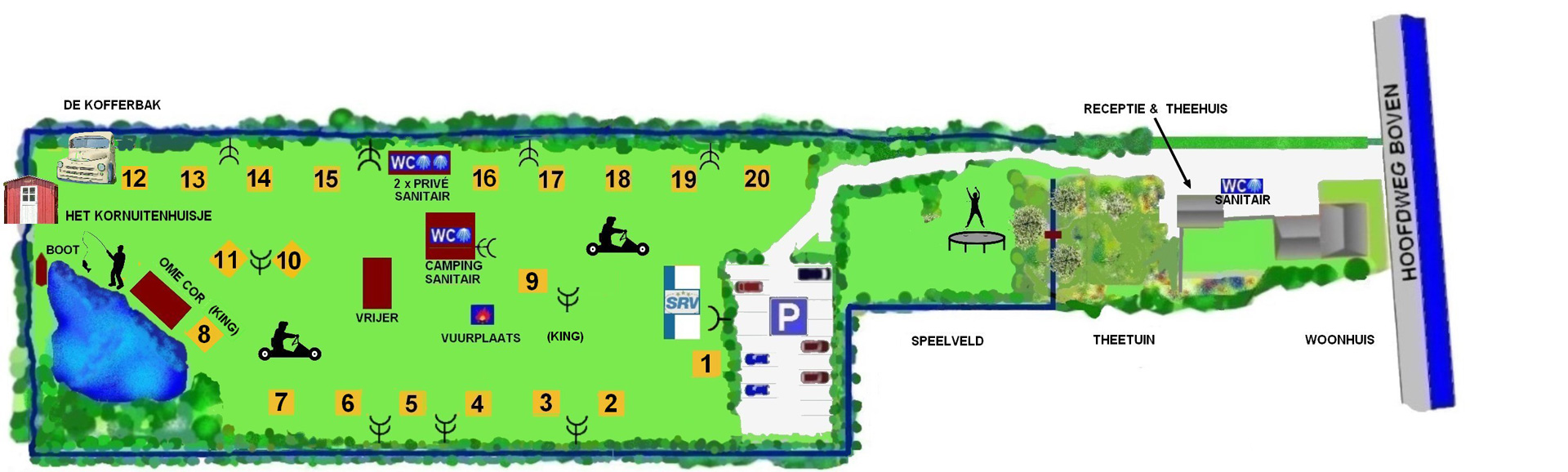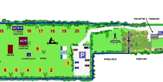 Bei Ihrer Ankunft sehen Sie zunächst das Haupthaus, dann den speziellen Teegarten (empfehlenswert!), den Spielplatz und schließlich das große Campinggelände. Insgesamt gibt es 25 Stellplätze, darunter einige sehr originelle Unterkünfte. Diese befinden sich zwischen den Stellplätzen und sorgen für das ultimative Campinggefühl. In der Mitte befindet sich die gemeinsame Feuerstelle. Wenn man sich umschaut, sieht es aus wie in einem Museum, ganz nostalgisch. Das liegt vor allem an den liebevoll eingerichteten Unterkünften. Wie wäre es mit einer Übernachtung in einem alten Wohnmobil, in einem Feuerwehrauto 'Wodan', bei Onkel Cor alias 'Pipowagen' oder im Retro-Wohnwagen Snoes. Eine weitere Besonderheit, die von den Campinggästen sehr geschätzt wird, ist der Plattenspieler mit LPs im Sanitärgebäude, und dann haben wir noch die berühmten Pizzaabende vergessen.