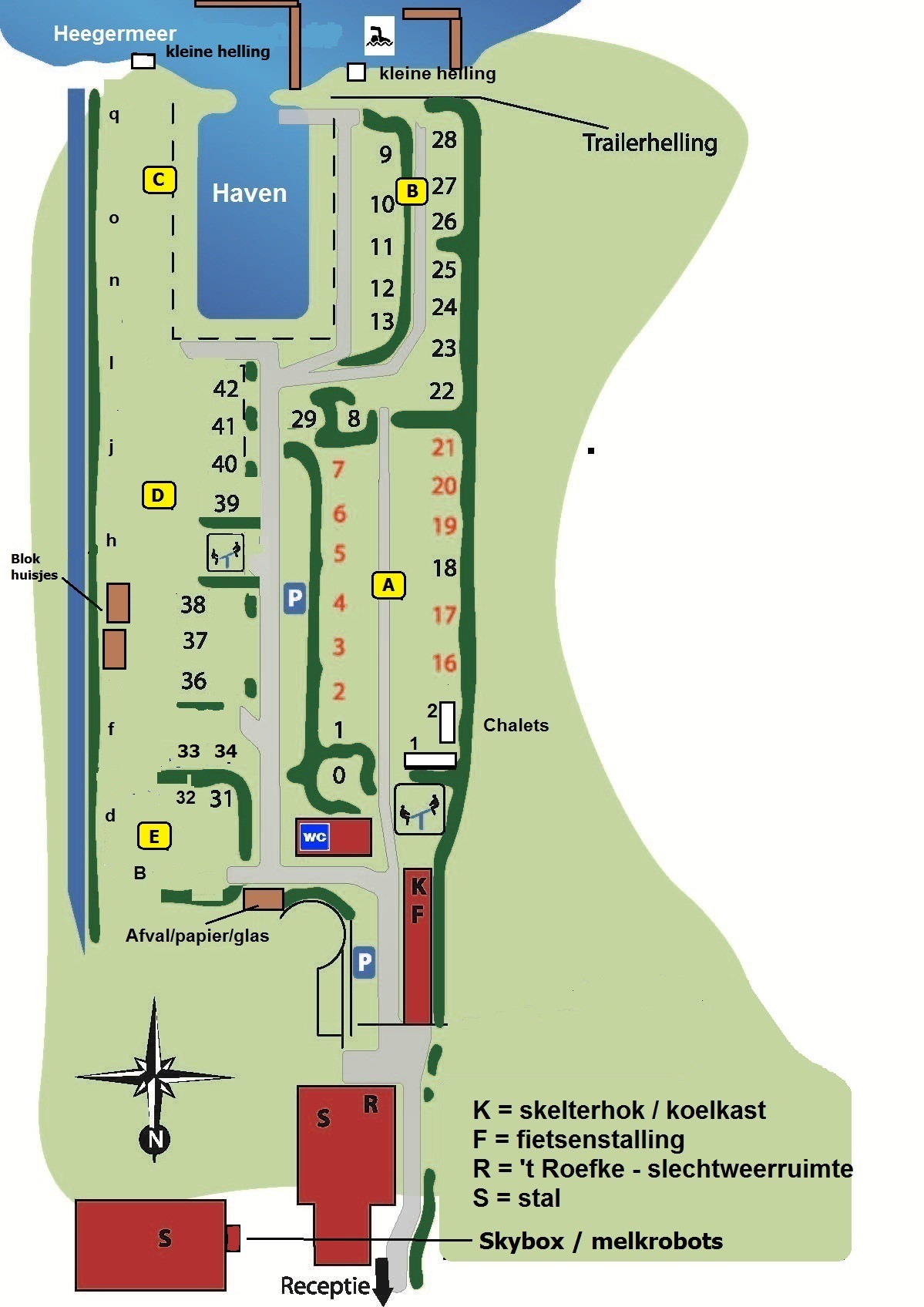 Der Campingplatz verfügt über ca. 30 geräumige touristische Stellplätze und einige Saisonstellplätze. Sie können auf einem der großen Felder oder direkt am kleinen Hafen campen. Der Campingplatz bietet einen Bootsverleih an, aber Sie können auch Ihr eigenes Boot mitbringen, da es eine direkte Verbindung zum Heegermeer gibt. Am Heegermeer finden Sie Picknicktische und verschiedene Sonnen-, Bade- und Angelplätze. Der Campingplatz verfügt über ein modernes Sanitärgebäude mit behindertengerechten Einrichtungen und einem Babyraum. Für Kinder gibt es mehrere Spielplätze, Go-Karts und ein Trampolin. In der Hochsaison werden regelmäßig Aktivitäten organisiert. Bei schlechtem Wetter können Sie auch den überdachten Freizeitraum nutzen. Auf dem Bauernhof sind Sie überall willkommen, um sich umzusehen oder mitzuhelfen. Der Bauer erzählt Ihnen gerne etwas über den Hof, die Kühe und die Umgebung.