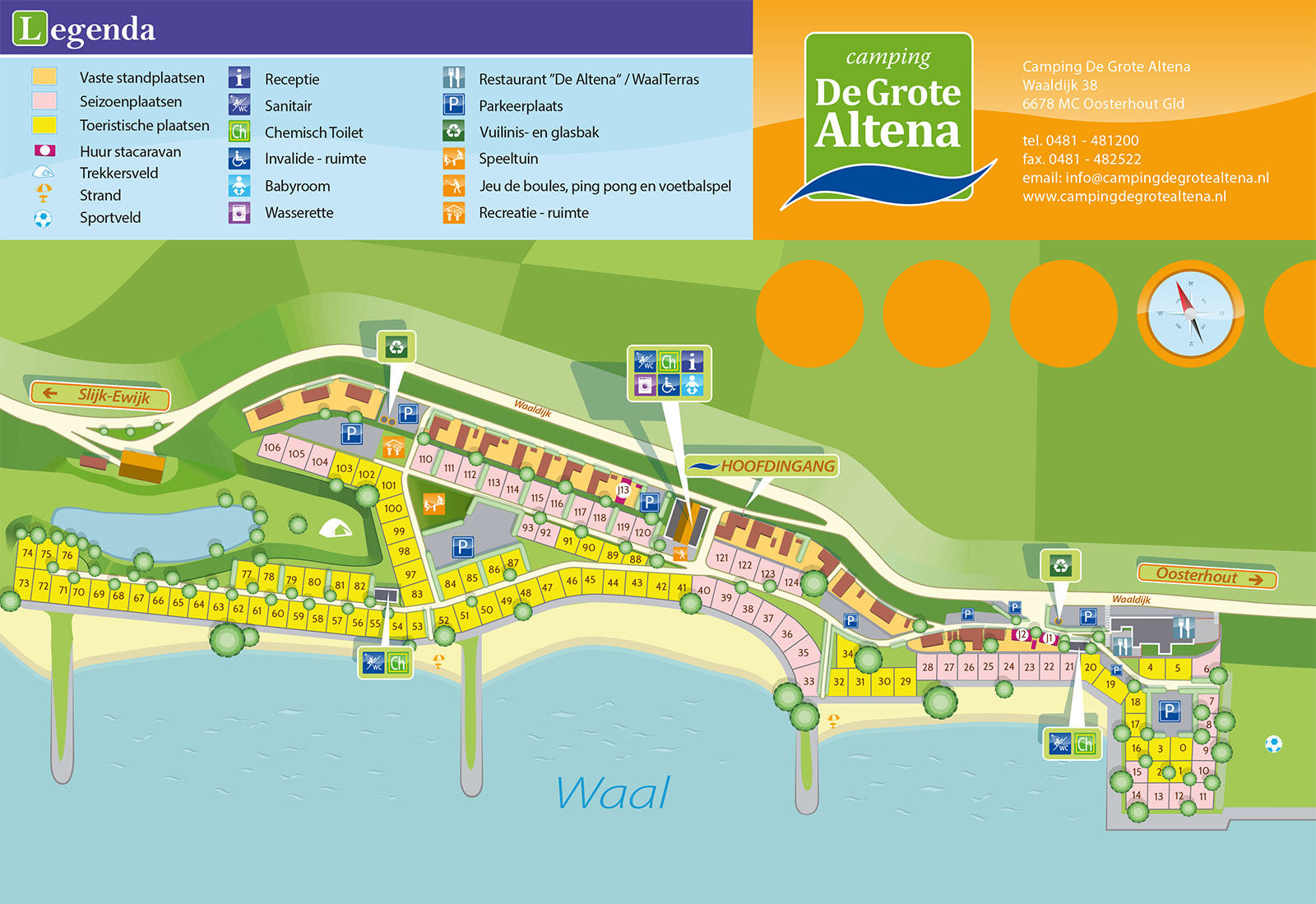 Der Campingplatz verfügt über ca. 125 komfortable Stellplätze, von denen die meisten direkt am Wasser gelegen sind. So können Sie von jedem Stellplatz aus die schöne Aussicht auf den Fluss und die Schifffahrt genießen. Jeder Stellplatz hat einen eigenen Strom- und Wasseranschluss sowie einen Abfluss. Darüber hinaus verfügt unser Campingplatz über moderne Sanitäranlagen, eine attraktive Waalterrasse, ein Restaurant, einen Aufenthaltsraum und zahlreiche Sport- und Spielmöglichkeiten. Frische Brötchen und verschiedene Zeitungen sind täglich an der Rezeption erhältlich. Für kürzere oder längere Aufenthalte können Sie bei uns in einem unserer 3 zu vermietenden Mobilheime wohnen. Wir vermieten auch Fahrräder und Digitenne. Unser Campingplatz zeichnet sich durch eine ruhige und freundliche Atmosphäre aus. Das macht ihn besonders bei Naturliebhabern, Ruhesuchenden, Radfahrern, Wanderern und Senioren sehr beliebt.